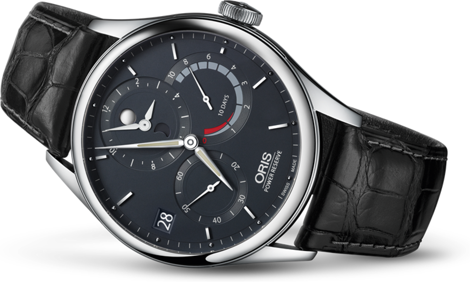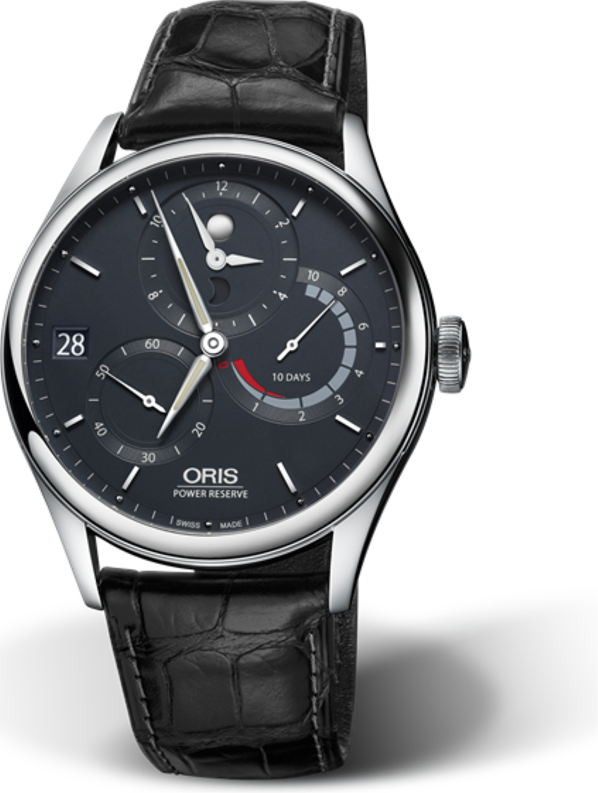 toho je strojek vlastní výroby s úžasnou rezervou chodu 10 dní.  Oris tento svůj strojek osazuje poté různými nástavbami (hodinářskou terminologií