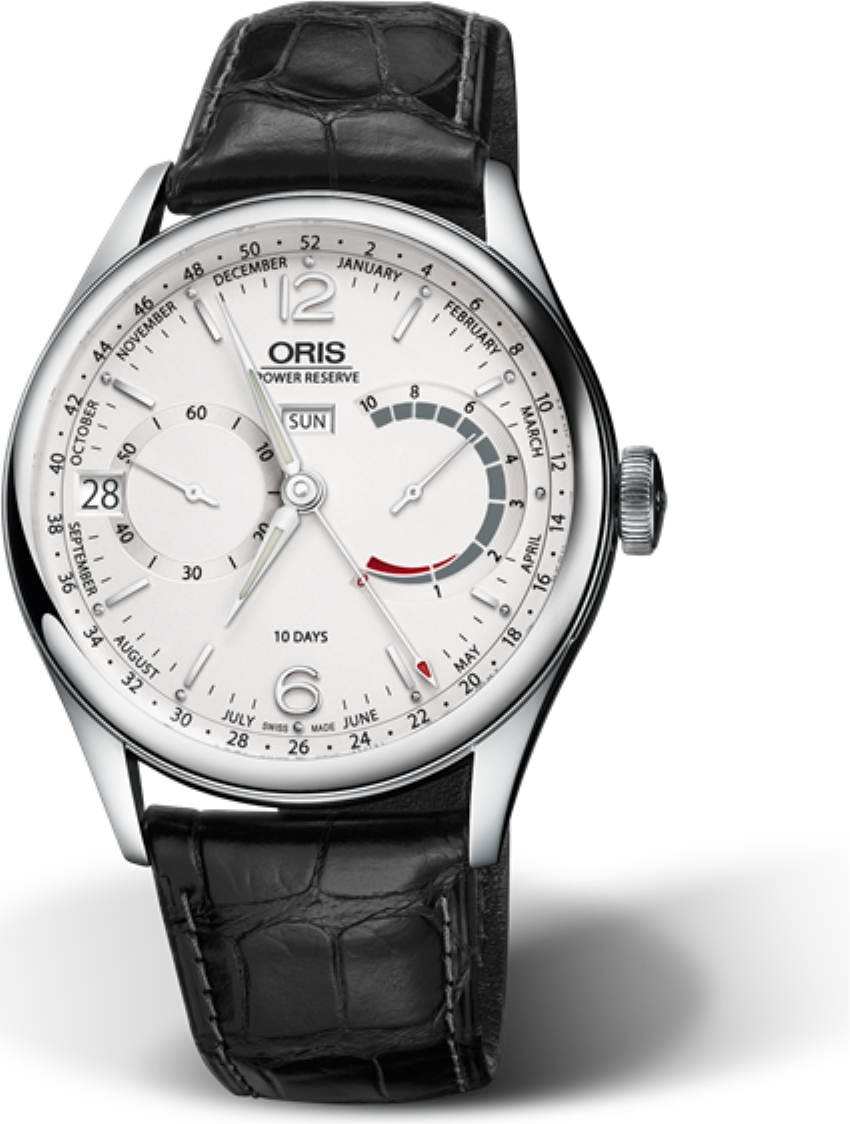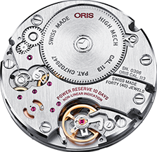 toho je strojek vlastní výroby s úžasnou rezervou chodu 10 dní.  Oris tento svůj strojek osazuje poté různými nástavbami (hodinářskou terminologií