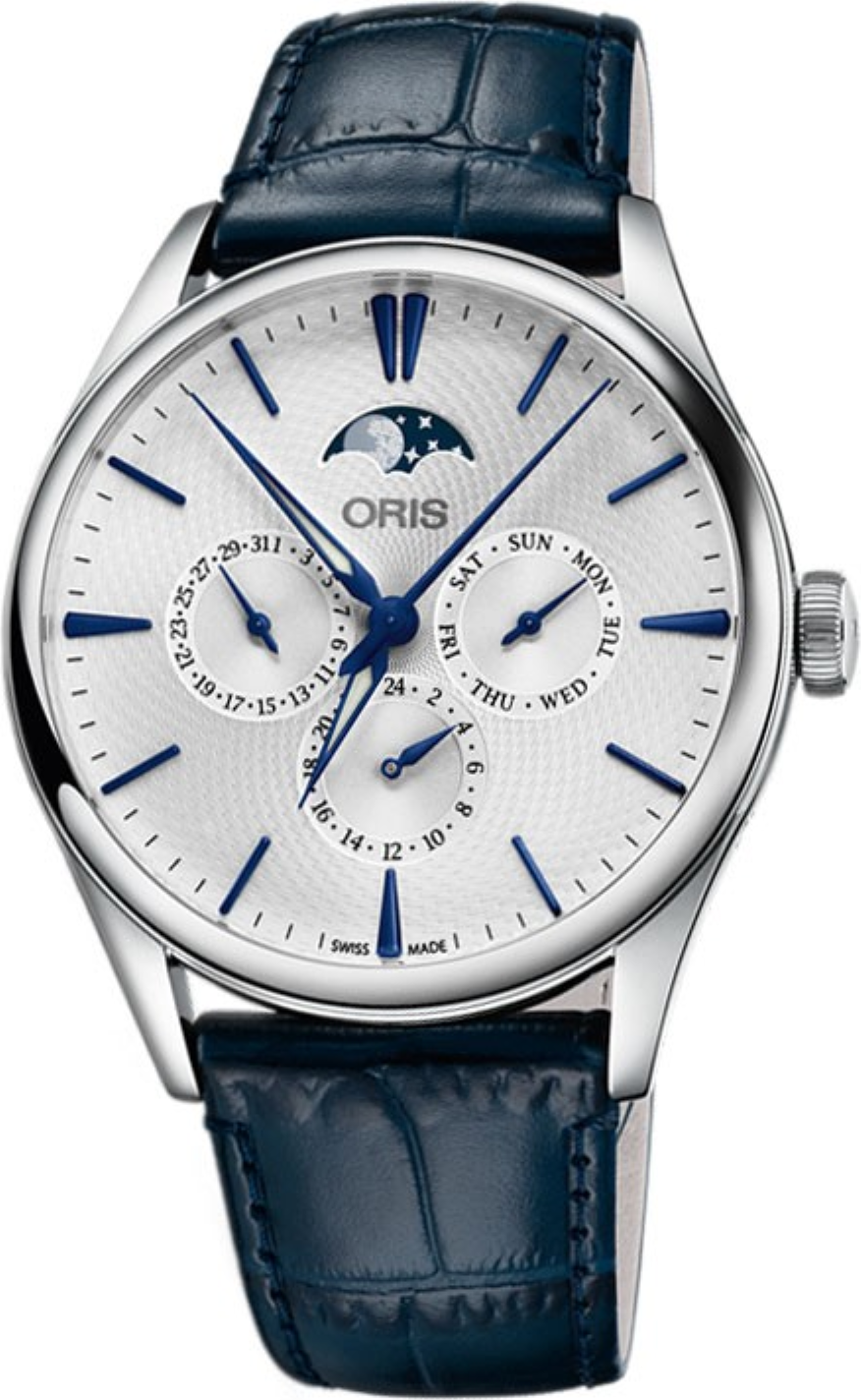 • Funkce a popis:Čas, datum, den v týdnu, druhé časové pásmo (GMT), měsíční fáze, strojek Swiss Oris 781(základ Sellita SW 200-1 / Eta 2824) = 26 kamenových uložení, 28.800 polokmitů setrvačky za hodinu (4Hz) = přesnost chodu 2 - 4 vteřiny denně, rezerva chodu 38 hodin, hodinky se natahují automaticky (pohybem ruky) + lze natáhnout/dotáhnout hodinky i ručně korunkou, prosklené zadní víčko hodinek pro náhled na strojek, ručičky jsou potažené svítící (luminiscenční) vrstvou (Super-LumiNova), číselník je světle stříbrný s gilošovanou estetickou úpravou