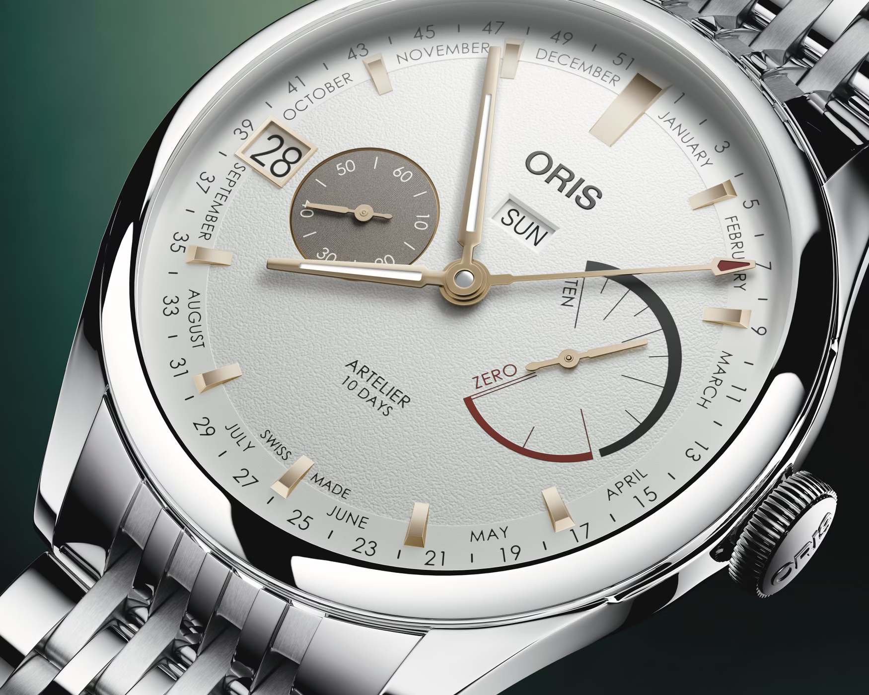 Mechanický strojek Oris Calibre 113 disponuje s úžasnou rezervou chodu 10 dní.