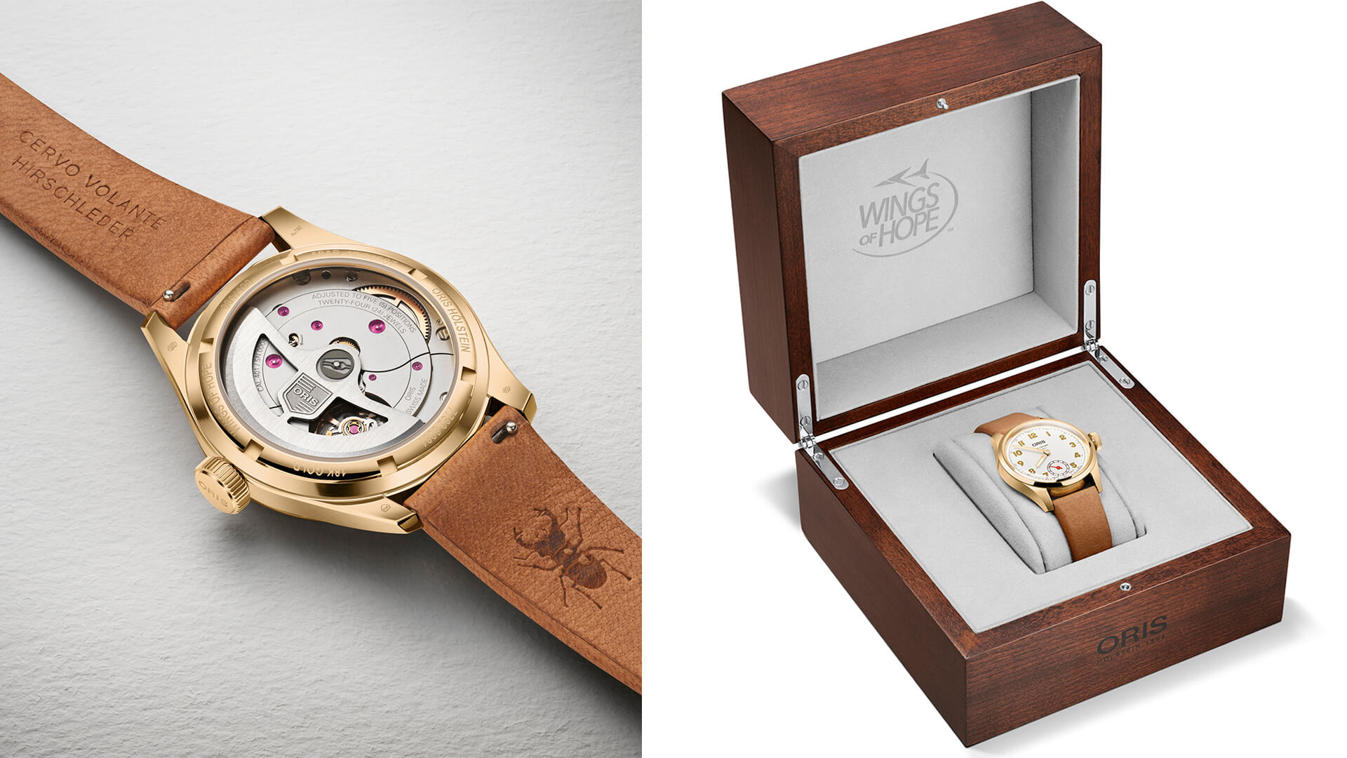 Oris představuje limitovanou edici 100 kusů pilotních hodinek Big Crown poháněných kalibrem 401 na podporu letecké charitativní organizace Wings of Hope. Má pouzdro z 38,00 mm 18karátového zlata, voděodolnost 5 barů a pohyb je viditelný přes zadní stranu pouzdra ze safírového skla.