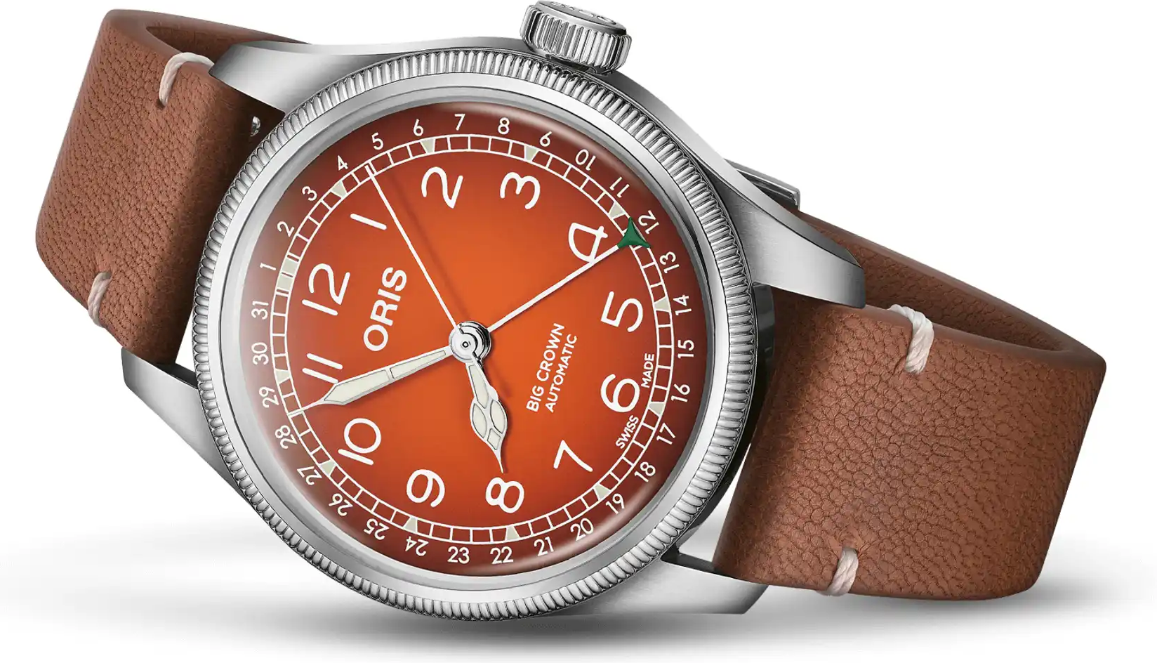 Nová edice Oris X Cervo Volante navazuje na ikonickou linii Big Crown Pointer Date, tentokrát s číselníkem, jehož teplé oranžovo-hnědé tóny s jemným gradientem připomínají spálený západ slunce a kaštany pečené na ohni. Pod vyklenutým safírovým sklíčkem s vnitřní antireflexní vrstvou