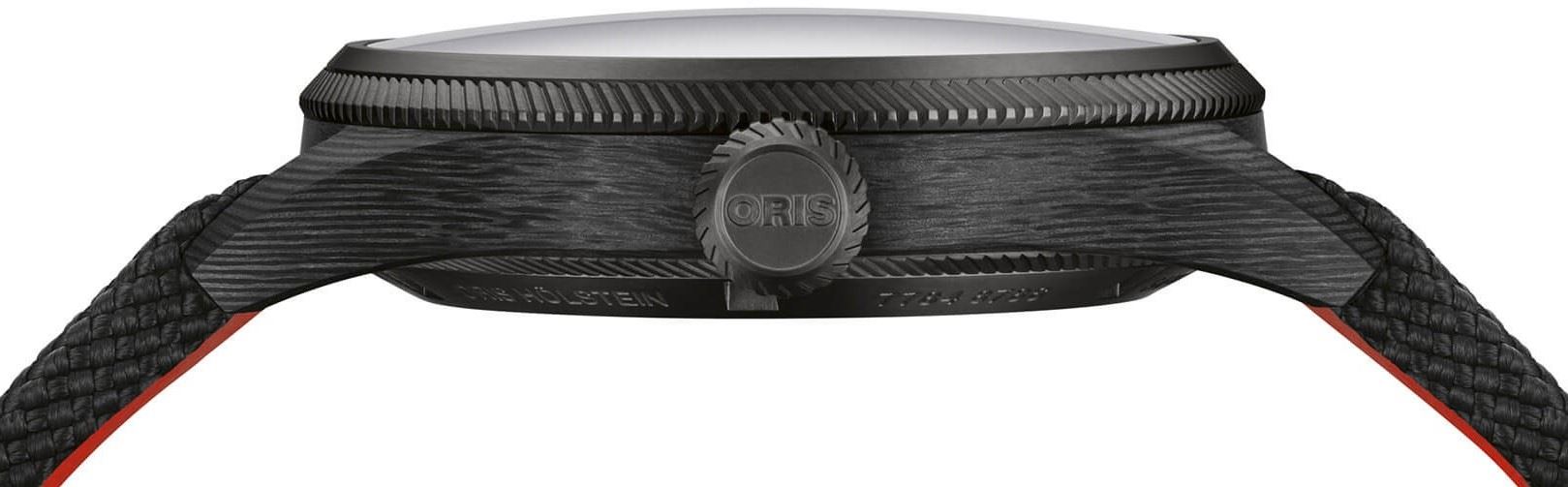 vidíme vroubkovaný okraj lunety a tenkou část pouzdra pod lunetou).Čitelnost je pro hodinky značky Oris prioritou. Proto nanáší na většinu ručiček a