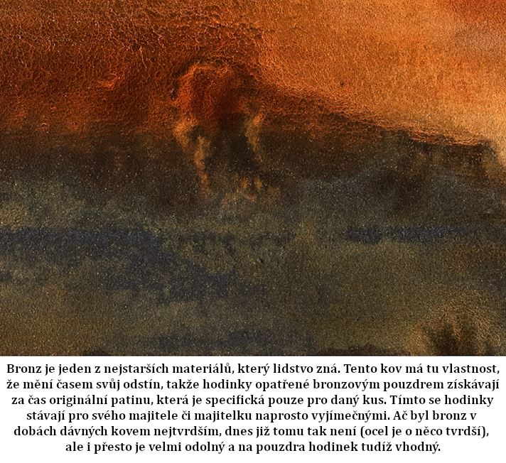 za čas originální patinu, která je specifická pouze pro daný kus. Tímto se hodinky stávají pro svého majitele či majitelku naprosto výjimečnými. Ač byl bronz v