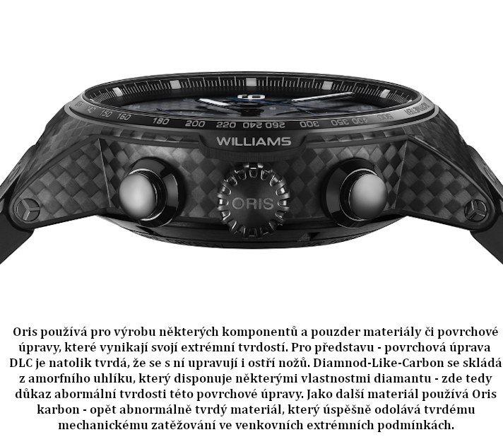 DLC je natolik tvrdá, že se s ní upravují i ostří nožů. Diamnod-Like-Carbon se skládá z amorfního uhlíku, který disponuje některými vlastnostmi diamantu - zde tedy důkaz abormální tvrdosti této povrchové úpravy. Jako další materiál používá Oris karbon - opět abnormálně tvrdý materiál, který úspěšně odolává tvrdému mechanickému zatěžování ve venkovních extrémních podmínkách.Čitelnost je pro hodinky značky Oris prioritou. Proto nanáší na většinu ručiček a