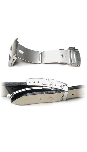 Tato jednodílná překlápěcí spona se vyrábí v jednom barevném provedení - ocelová (stříbrná). Šíře spon pro kožené pásky jsou 18mm a 20mm. Uchycení ve sponě je pro tloušťku konce pásku 3mm. Výhody této překlápěcí spony jsou: 1. Rychlejší a snadnější obsluha zapínání 2. Delší životnost koženého řemínku 3. Minimální možnost ztracení hodinek při nechtěném rozepnutí spony (spona je jednodílná).
