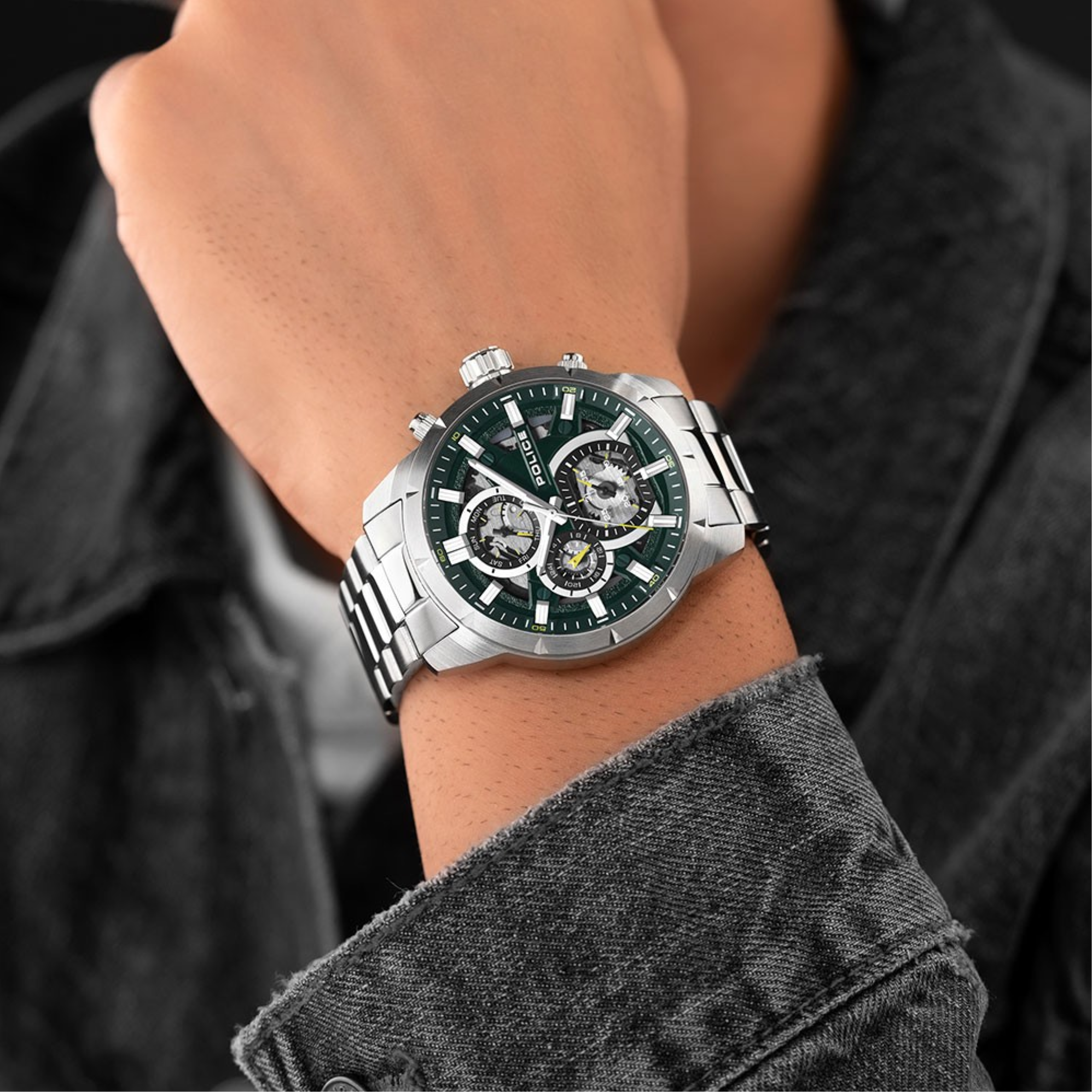 Quartz znamená latinsky krystal. Je tedy zřejmé, že hodinky nemohou být poháněny krystalem - jsou jím, jak již bylo zmíněno výše, řízeny pro maximální přesnost chodu. Krystal je Alfa a Omega přesnosti hodinek - respektive jeho kvalita. Čím je krystal kvalitnější, tím lépe usměrňuje frekvenci kmitů a impulsy jdoucí k magnetickému rotoru jsou stabilnější a chod hodinek je poté přesnější. Kvalita krystalu není úplně směrodatná pouze u hodinek rádiem řízených či hodinek řízených signálem GPS, jelikož tyto hodinky jsou každý den seřizovány signálem pro naprosto přesný čas (obvykle 2x denně). Časový rozdíl, který může vzniknout v mezidobí příjmu signálu je díky dnešním kvalitním krystalům tak nepatrný (cca. setiny vteřiny), že není možné tuto diferenci okem zaznamenat. U hodinek řízených krystalem je pohon zajišťován baterií - napájecím článkem nebo akumulátorem, který se dobíjí např. světlem. Baterie v hodinkách vydrží - dle typu elektroniky a celkově sestrojení strojku - 2 - 10 let. Je důležité vědět, že nejmenší spotřebu napájecího článku (baterie) mají hodinky digitální. Je to proto, protože zde není žádný velký spotřební přísun energie - nasvicuje se zde "pouze" tekutý krystal. Naopak největší spotřebu mají quartzové hodinky v případě zapnutí ručkového chronografu, kdy spolu s časem nám hodinky stopují. Zde je odběr baterie podstatně vyšší, nedoporučuje se tedy mít stále chronograf akční - pouze... (číst více)