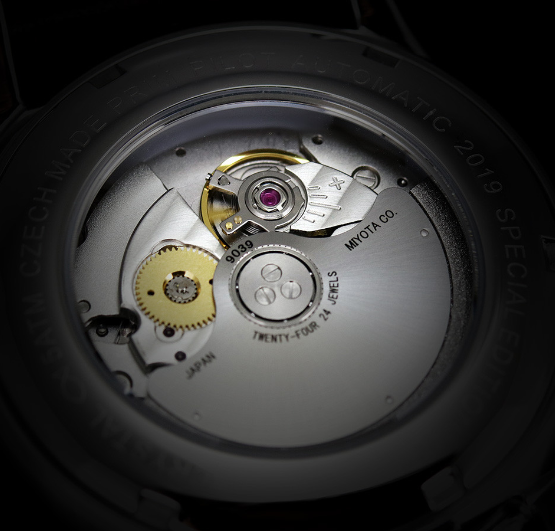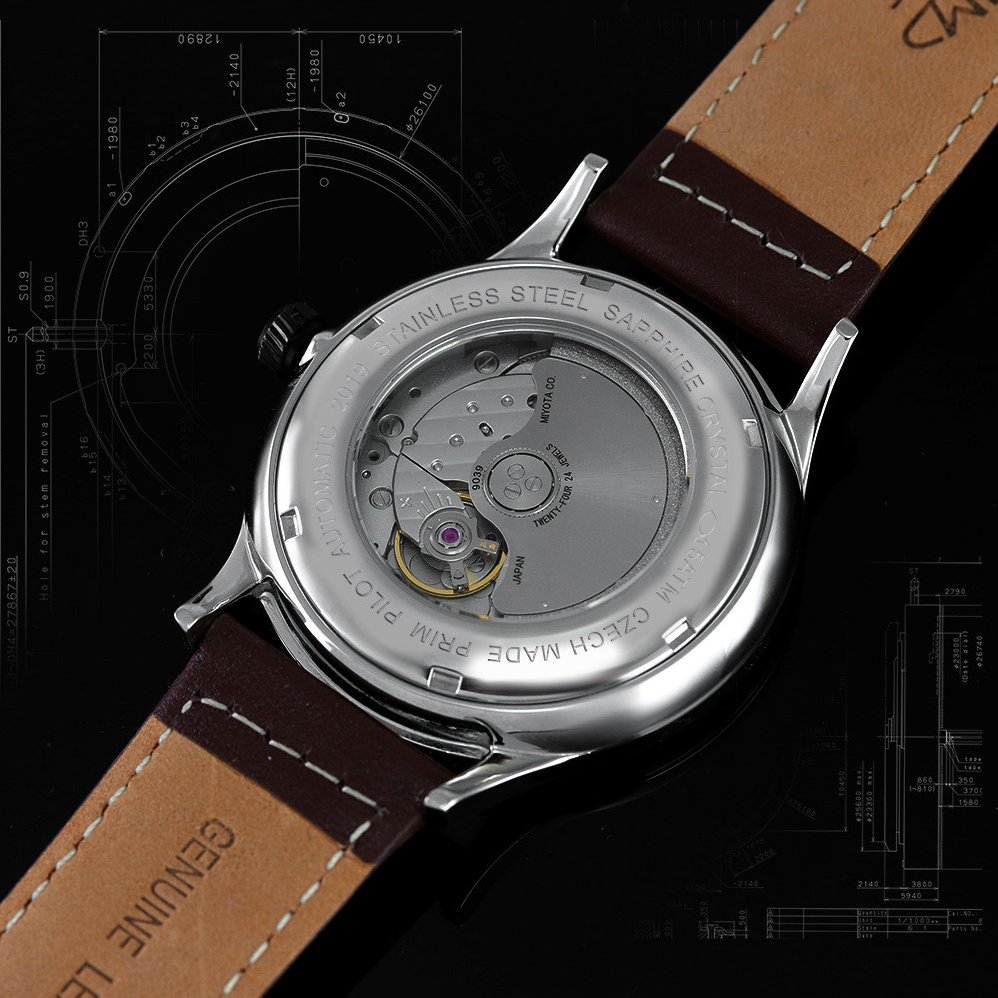 • Funkce a popis:Čas, automatický japonský strojek Miyota 9039 (24 kamenů), rezerva chodu 42 hodin, polokmity setrvačky 28.800/h (3 Hz) = přesnost chodu (diference) 2 - 4 vteřin denně (vysoké přesnosti stroje je docíleno jemnou regulací šroubků na ramínkách věnce setrvačky), automatický nátah (hodinky se natahují pohybem ruky) + ruční nátah (hodinky lze natáhnout/dotáhnout dle potřeby i ručně korunkou, ručičky a indexy jsou opatřeny tenkou vrstvou luminiscence (luminiscenční vrstva po nasvícení dlouhou dobu svítí, což je praktické za šera a v noci)
