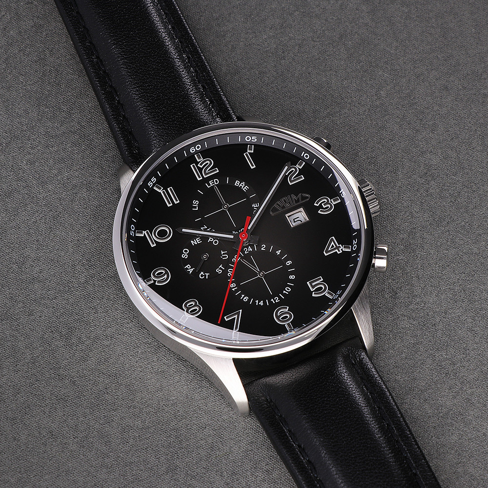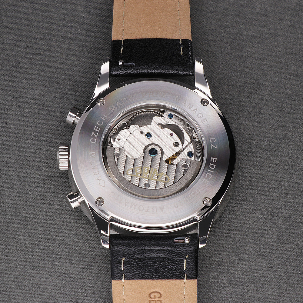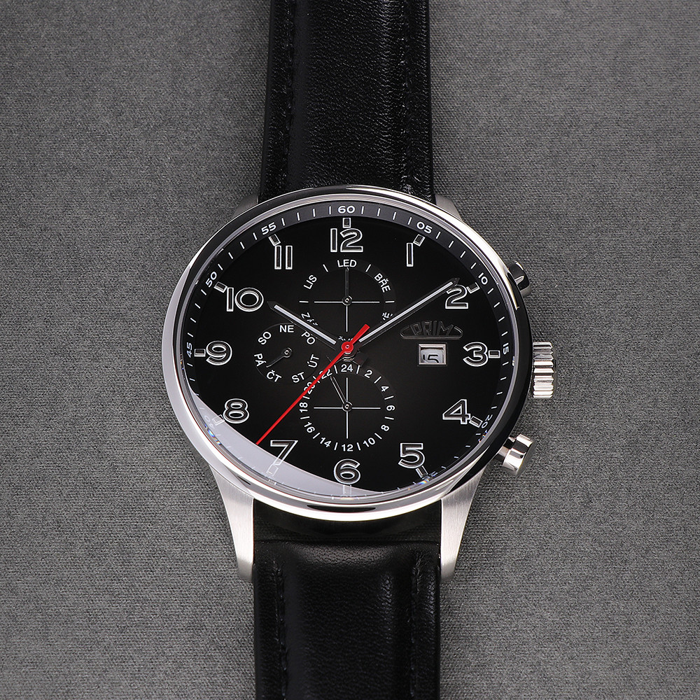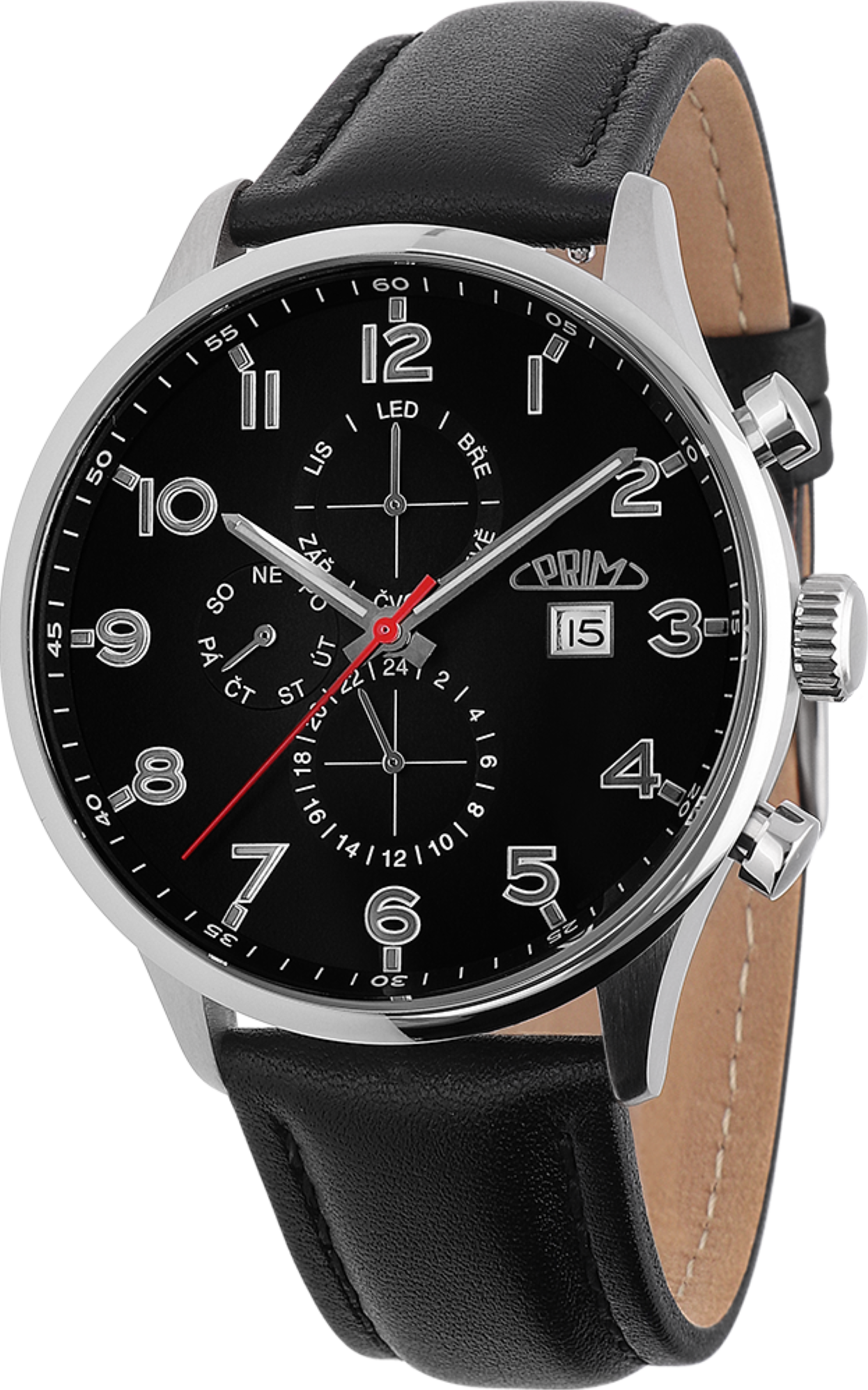 • Funkce a popis:Čas, datum, den v týdnu a měsíce v roce v češtině, duální 24 hodinový číselník, svítící ručičky, automatický strojek Prim 2867 s rezervou chodu 36 hodin, čísla na číselníku s 3D efektem - vystouplá z číselníku
