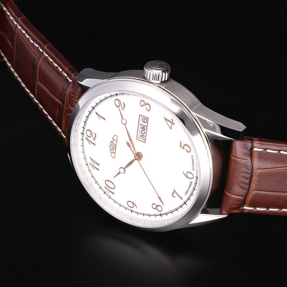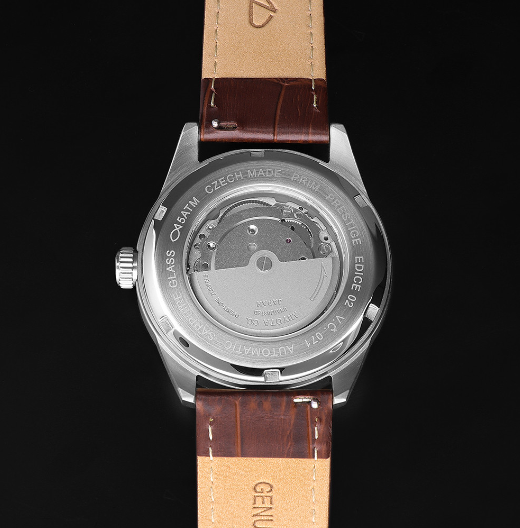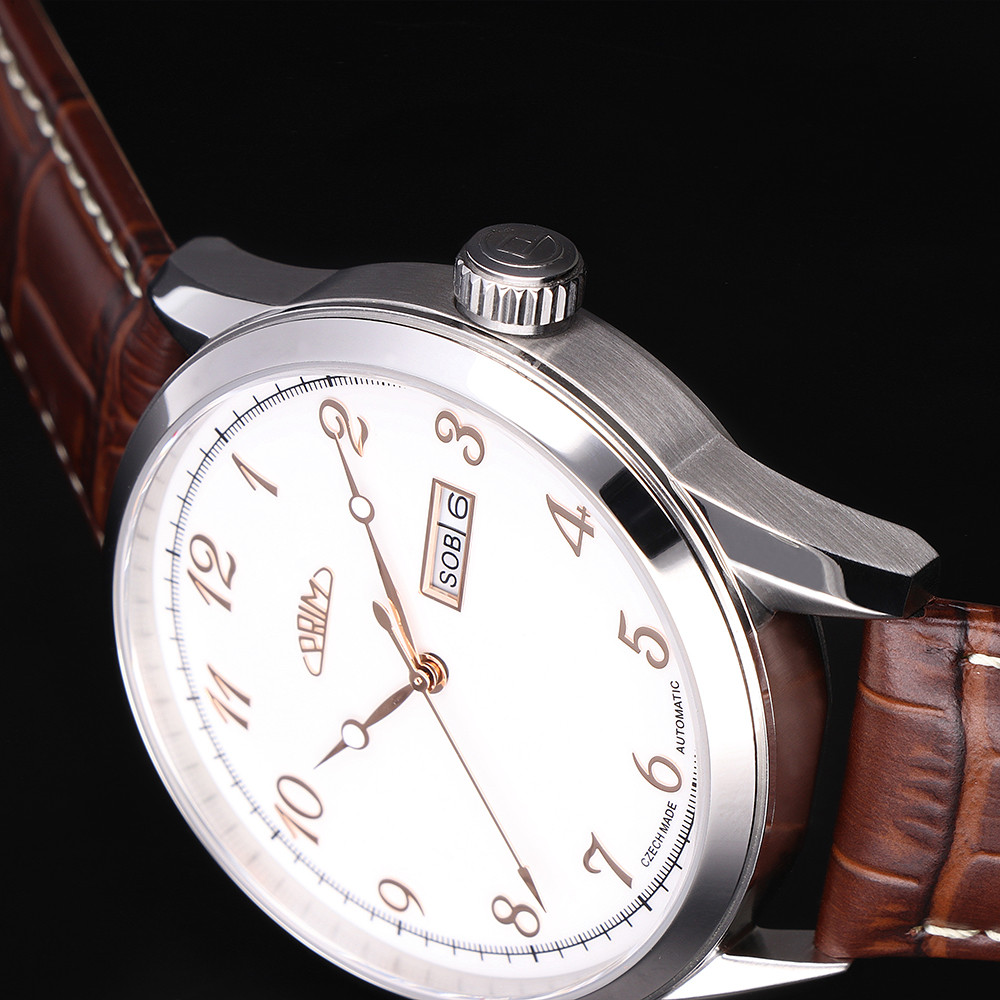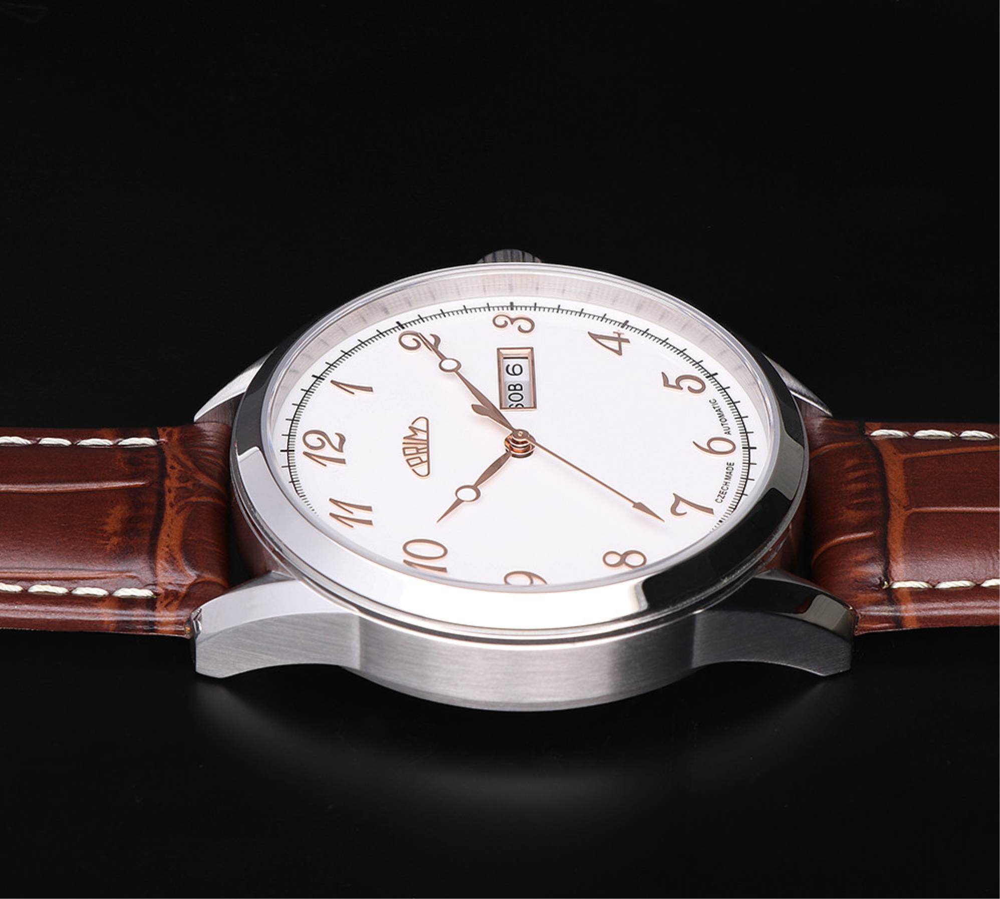• Funkce a popis:Čas, datum, dny v týdnu v češtině, automatický strojek 8205 s možností ručního nátahu (21 kamenů), rezerva chodu 42 hodin, polokmity setrvačky 21.600/h (3 Hz) = 3 - 6 vteřiny denně, pásek je z pravé kůže a  má speciální úpravu pro delší životnost, čísla na číselníku s 3D efektem - vystouplá z číselníku, na ručkách luminisceční body