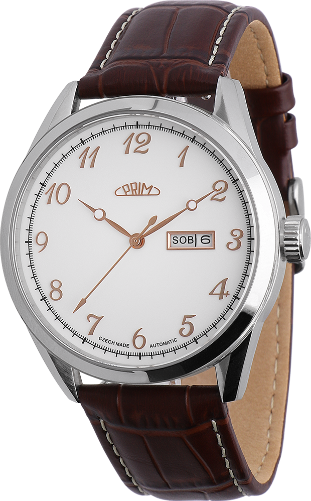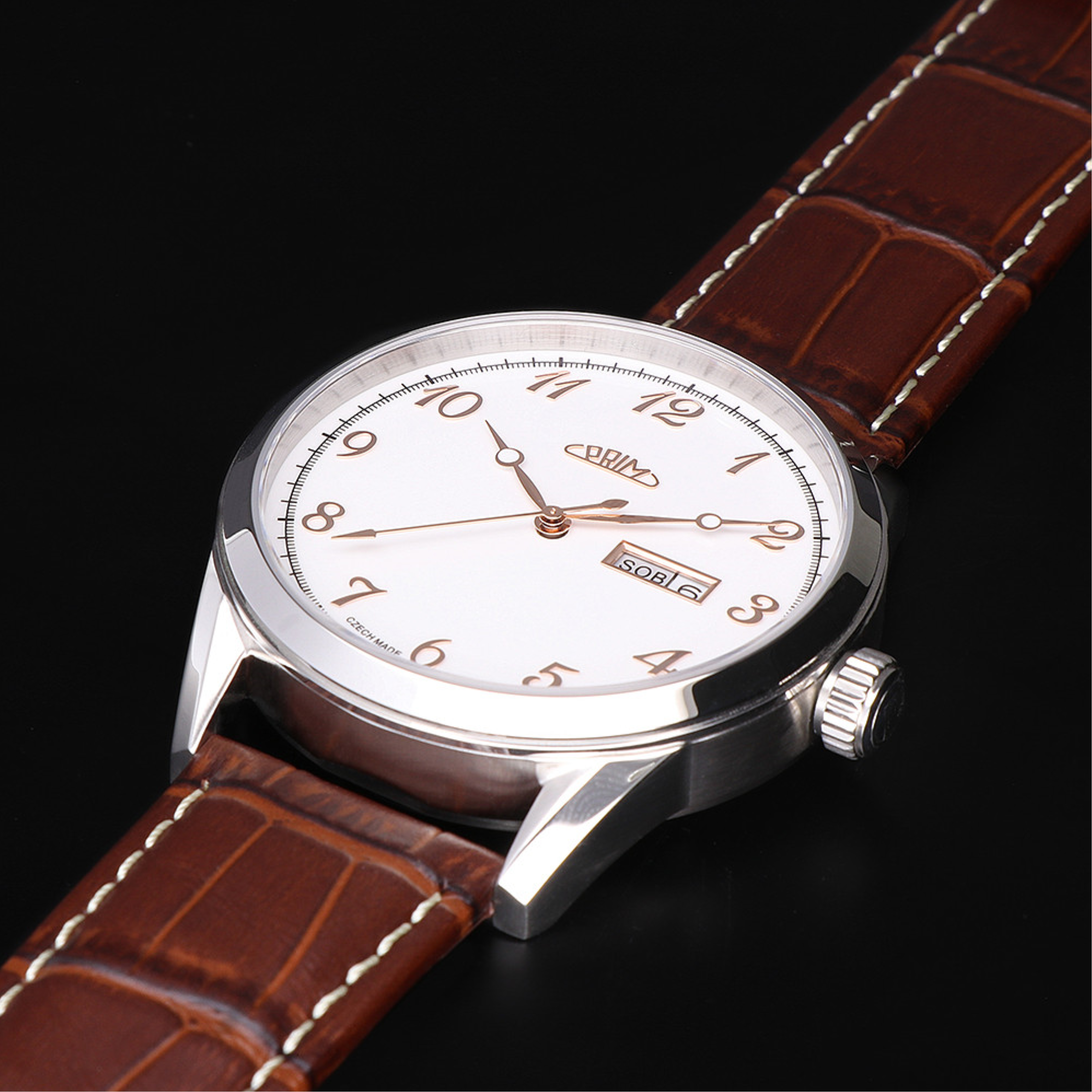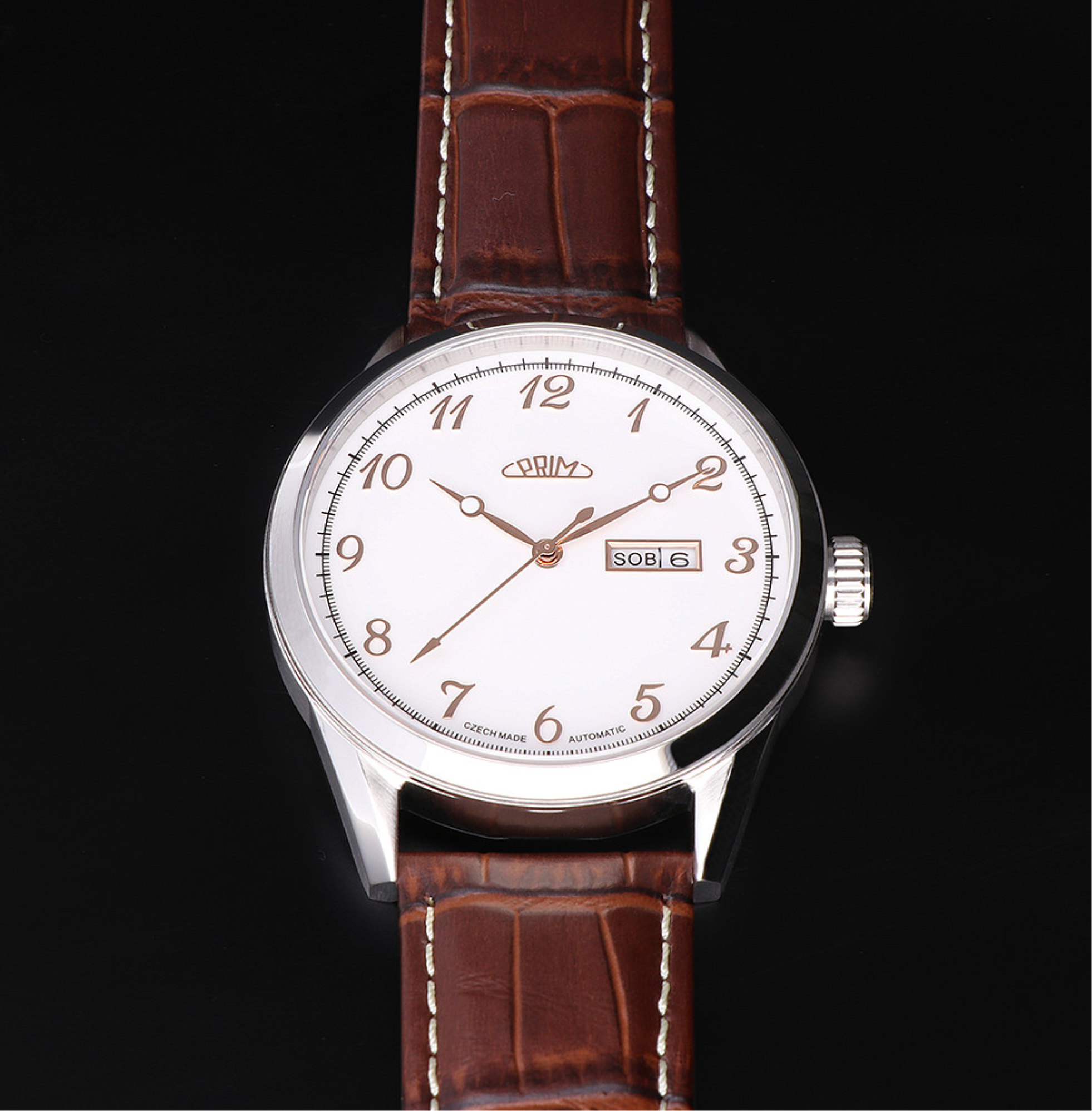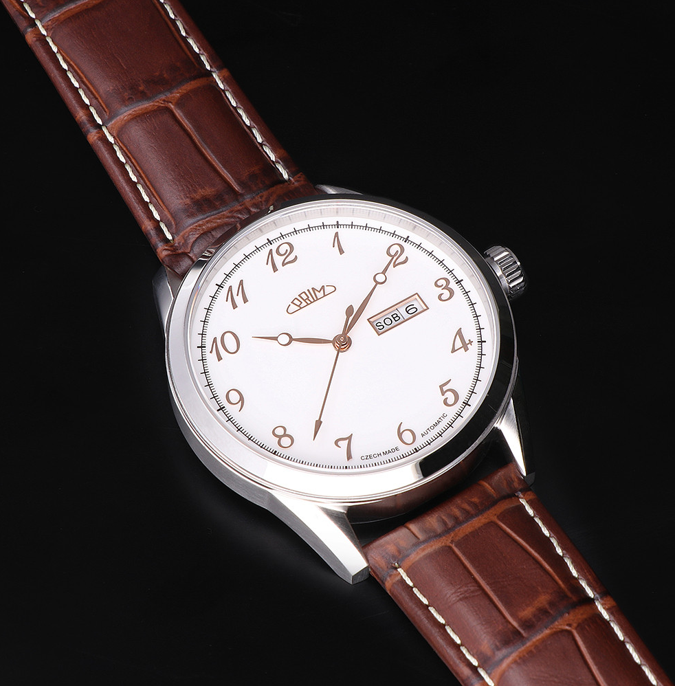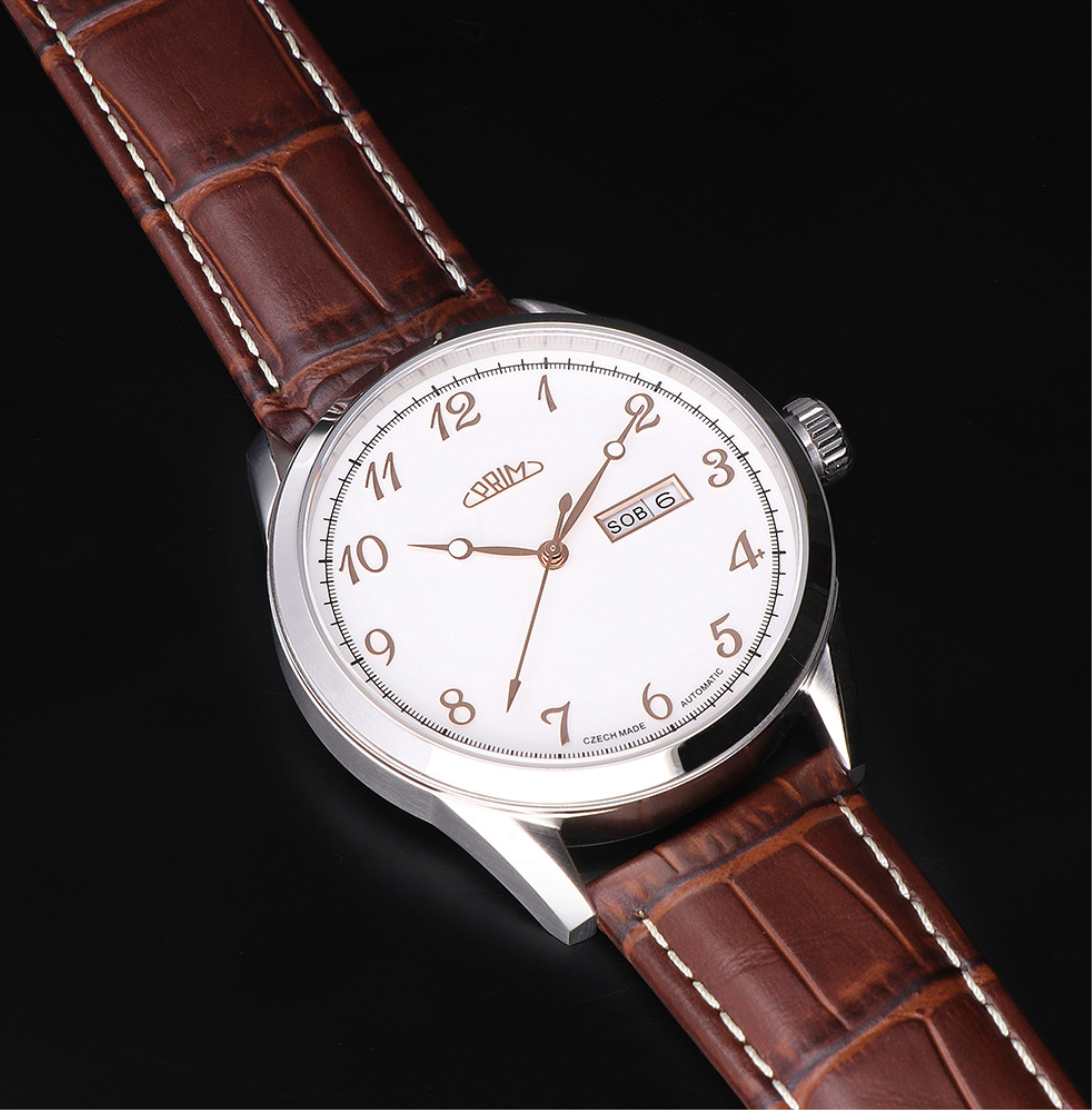 • Funkce a popis:Čas, datum, dny v týdnu v češtině, automatický strojek 8205 s možností ručního nátahu (21 kamenů), rezerva chodu 42 hodin, polokmity setrvačky 21.600/h (3 Hz) = 3 - 6 vteřiny denně, pásek je z pravé kůže a  má speciální úpravu pro delší životnost, čísla na číselníku s 3D efektem - vystouplá z číselníku, na ručkách luminisceční body