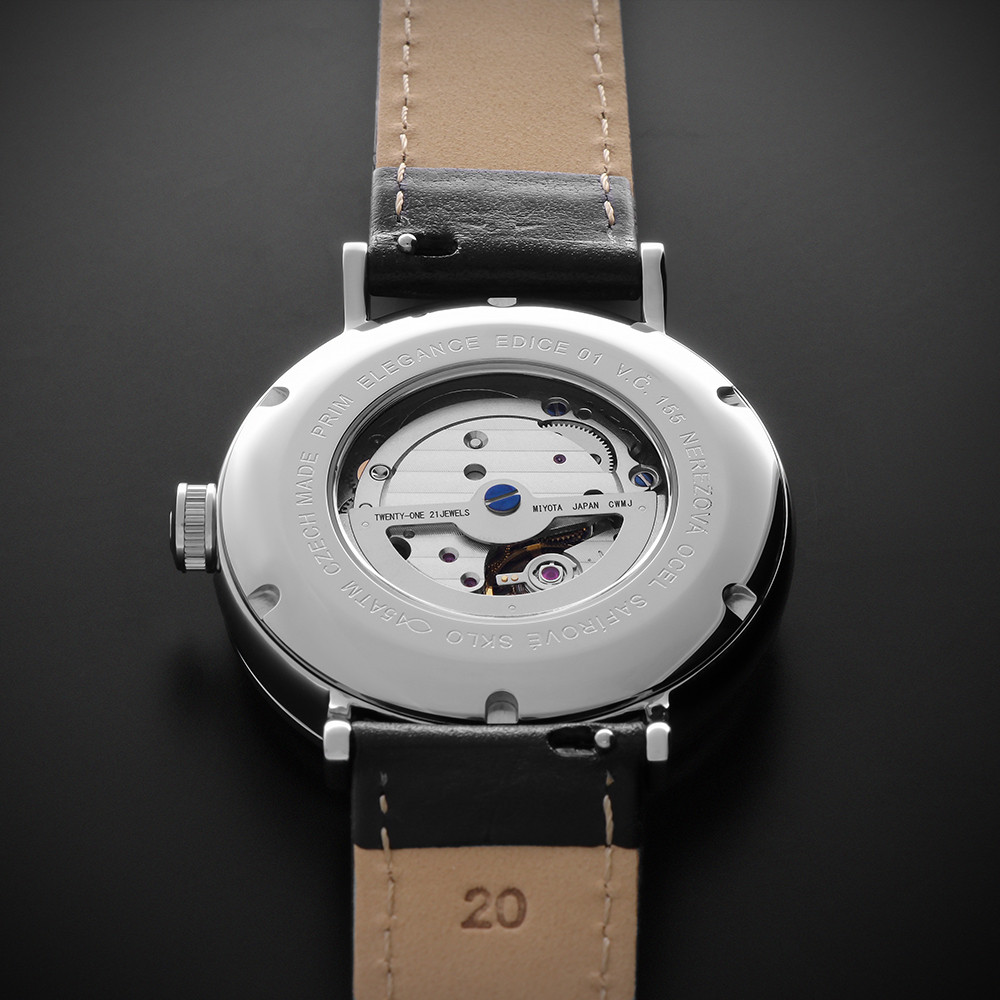 • Funkce a popis:Čas, datum, strojek Japan Miyota 8315 (21 kamenových uložení) = rezerva chodu až 60 hodin, polokmity setrvačky 21.600/h (3 Hz) = přesnost chodu (diference) 3 - 5 vteřin denně, automatický nátah (hodinky se natahují pohybem ruky) + ruční nátah (hodinky lze natáhnout/dotáhnout dle potřeby i ručně korunkou), rotor samonátahu disponuje funkcí oboustranného nátahu, zapínání - klasická trnová spona (přezka), průhledné zadní víčko pro náhled na strojek