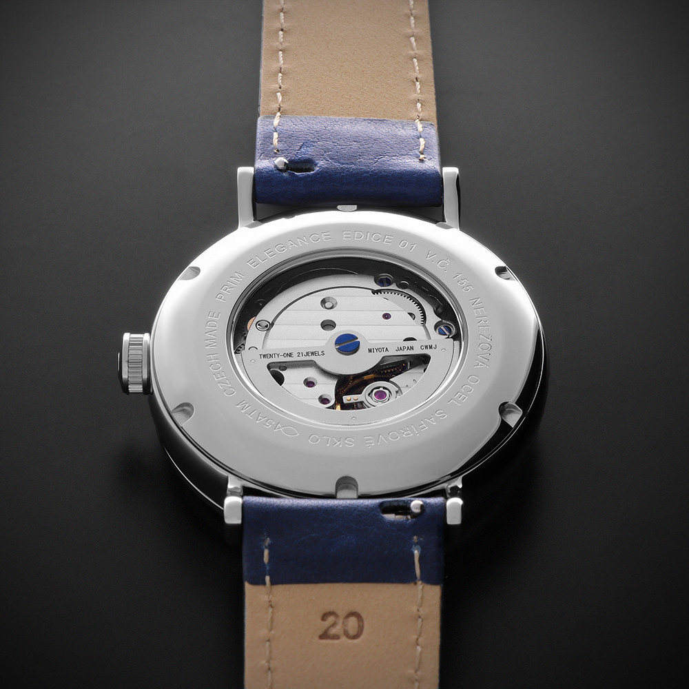 • Funkce a popis:Čas, datum, strojek Japan Miyota 8315 (21 kamenových uložení) = rezerva chodu až 60 hodin, polokmity setrvačky 21.600/h (3 Hz) = přesnost chodu (diference) 3 - 5 vteřin denně, automatický nátah (hodinky se natahují pohybem ruky) + ruční nátah (hodinky lze natáhnout/dotáhnout dle potřeby i ručně korunkou), rotor samonátahu disponuje funkcí oboustranného nátahu, zapínání - klasická trnová spona (přezka), průhledné zadní víčko pro náhled na strojek