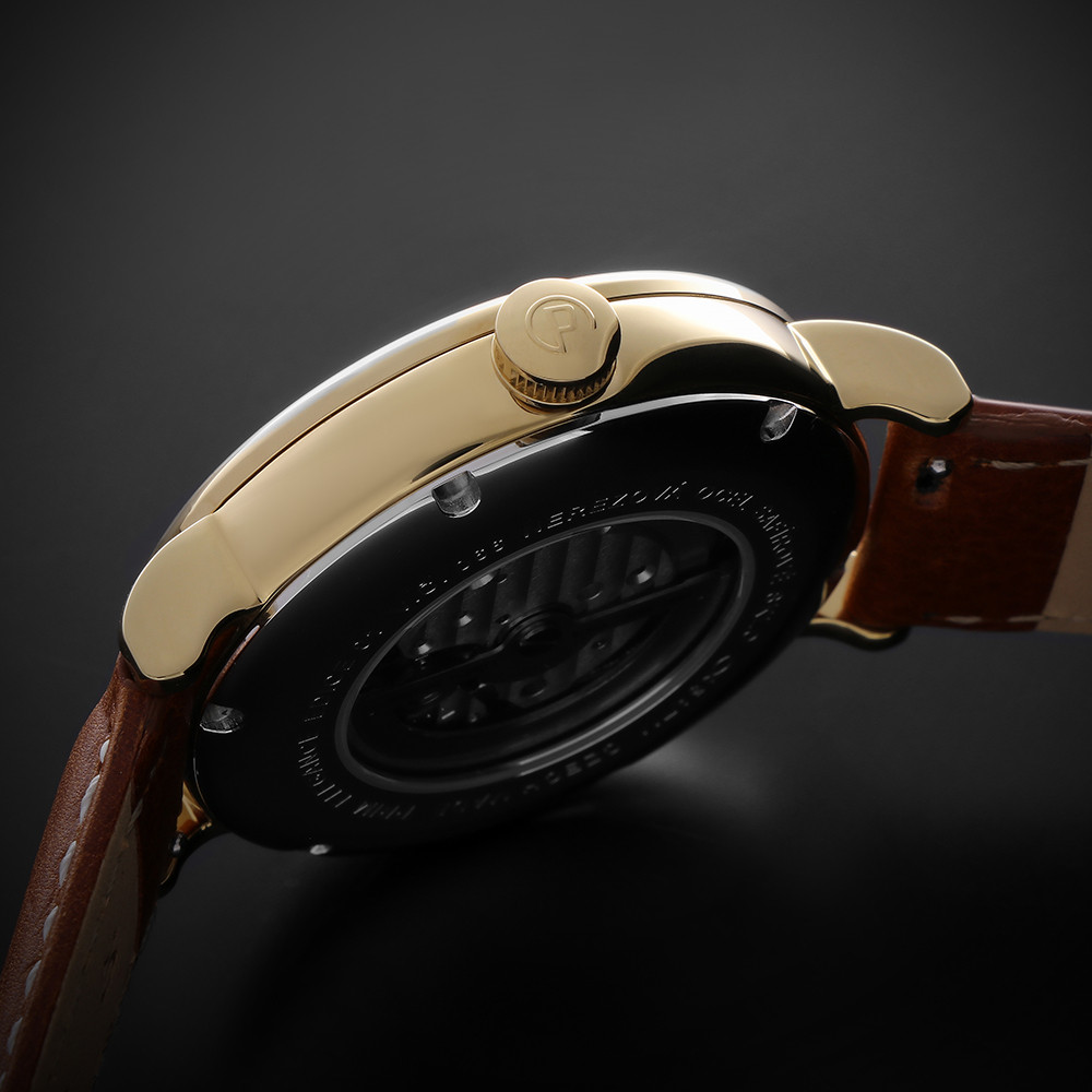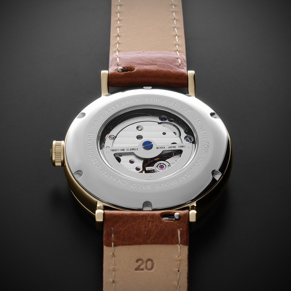 • Funkce a popis:Čas, datum, strojek Japan Miyota 8315 (21 kamenových uložení) = rezerva chodu až 60 hodin, polokmity setrvačky 21.600/h (3 Hz) = přesnost chodu (diference) 3 - 5 vteřin denně, automatický nátah (hodinky se natahují pohybem ruky) + ruční nátah (hodinky lze natáhnout/dotáhnout dle potřeby i ručně korunkou), rotor samonátahu disponuje funkcí oboustranného nátahu, zapínání - klasická trnová spona (přezka), průhledné zadní víčko pro náhled na strojek