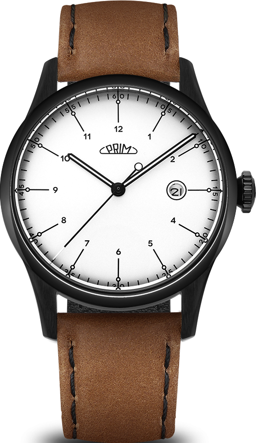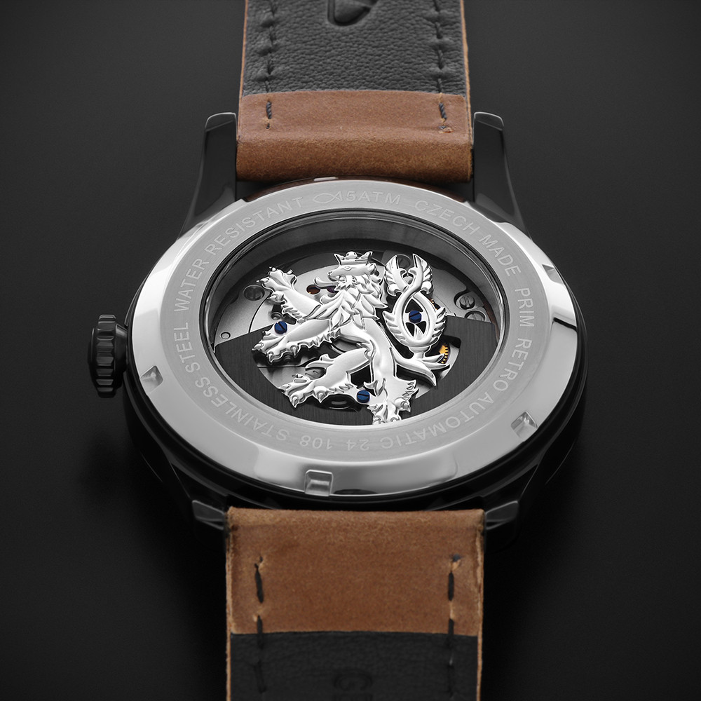 Společenské hodinky PRIM Retro Automatic 24 s automatickým natahováním a originálním unikátním rotorem PRIM (strojek 9015) Pouzdro je vyrobeno z kvalitní ušlechtilé nerezové oceli 316L s černou povrchovou úpravou  a uzavřeno nerezovým víčkem s průzorem. ...