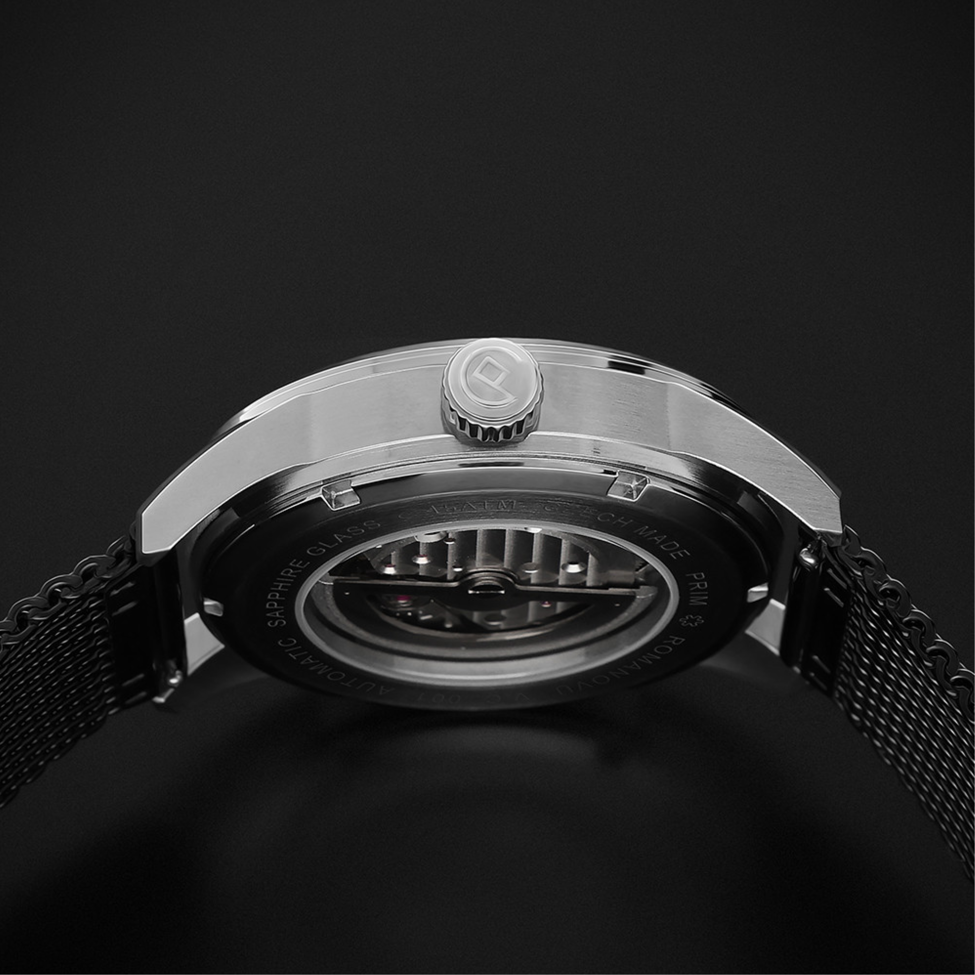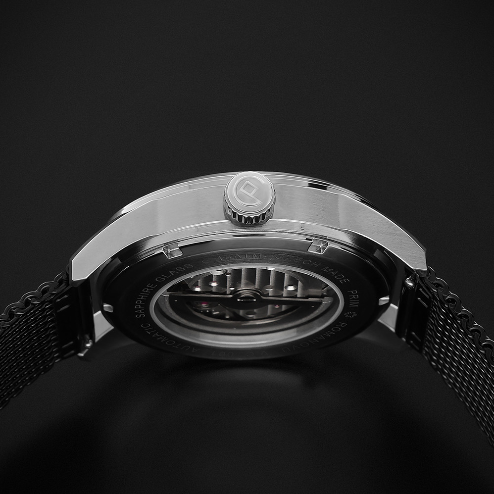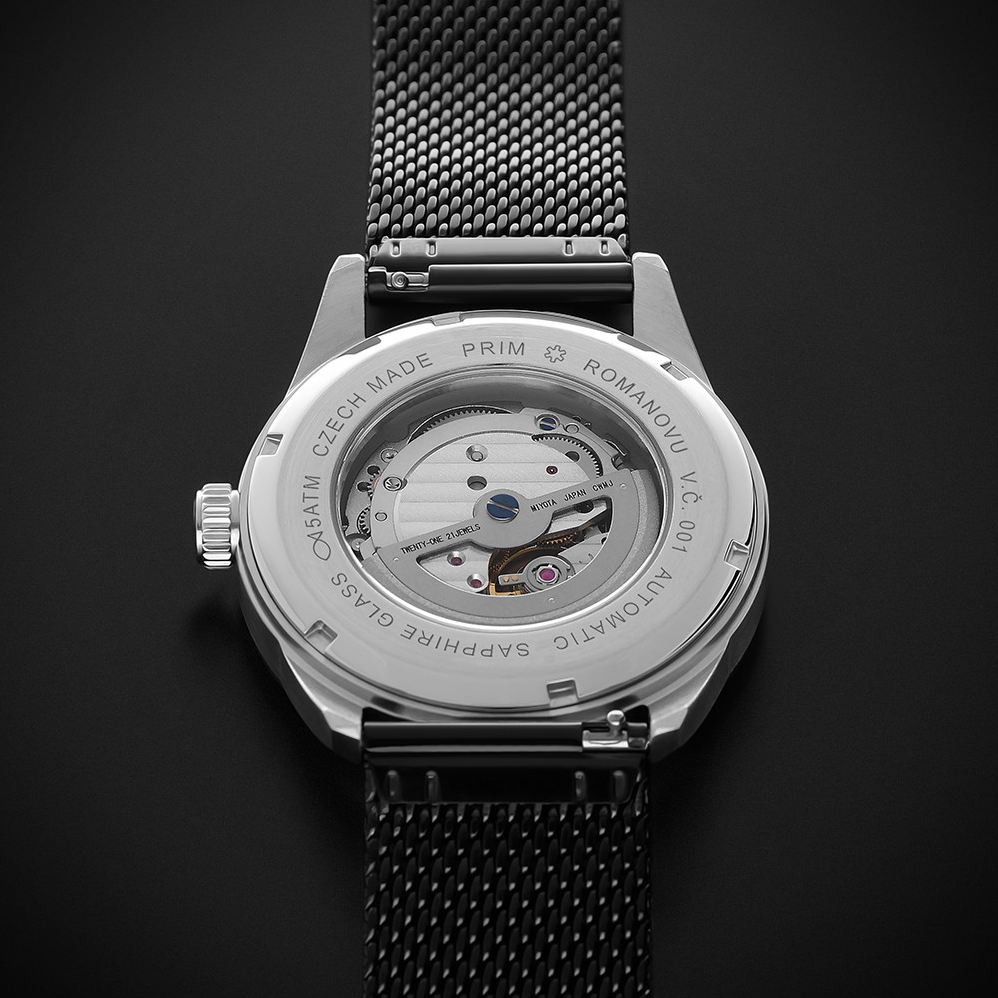 • Funkce a popis:Čas, datum, mechanický strojek s automatickým nátahem Japan Miyota 8315 (21 kamenových uložení) = rezerva chodu až 60 hodin, polokmity setrvačky 21.600/h (3 Hz) = přesnost chodu (diference) 4 - 7 vteřin denně, automatický nátah (hodinky se natahují pohybem ruky) + ruční nátah (hodinky lze natáhnout/dotáhnout dle potřeby i ručně korunkou), průhledné zadní víčko pro náhled na strojek, luminiscenční ručky