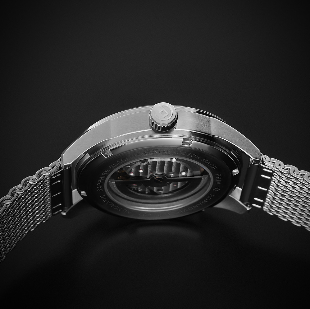 • Funkce a popis:Čas, datum, mechanický strojek s automatickým nátahem Japan Miyota 8315 (21 kamenových uložení) = rezerva chodu až 60 hodin, polokmity setrvačky 21.600/h (3 Hz) = přesnost chodu (diference) 4 - 7 vteřin denně, automatický nátah (hodinky se natahují pohybem ruky) + ruční nátah (hodinky lze natáhnout/dotáhnout dle potřeby i ručně korunkou), zapínání - klasická trnová spona (přezka), průhledné zadní víčko pro náhled na strojek, svítící ručky