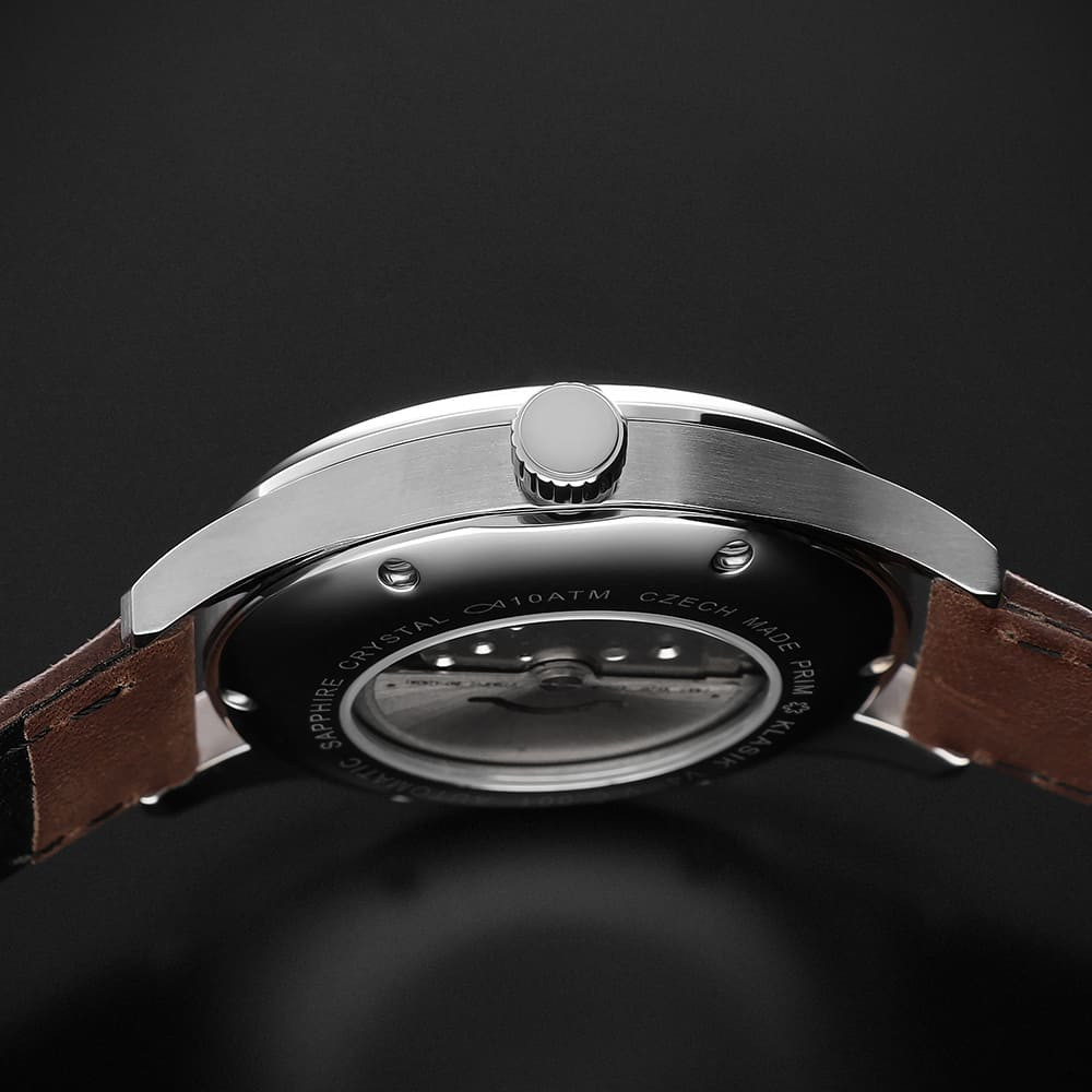 • Funkce a popis:Čas, datum, mechanický strojek s automatickým nátahem Japan Miyota 8215 (21 kamenových uložení) = rezerva chodu až 42 hodin, polokmity setrvačky 21.600/h (3 Hz) = přesnost chodu (diference) 4 - 7 vteřin denně, automatický nátah (hodinky se natahují pohybem ruky) + ruční nátah (hodinky lze natáhnout/dotáhnout dle potřeby i ručně korunkou), zapínání - klasická trnová spona (přezka), průhledné zadní víčko pro náhled na strojek