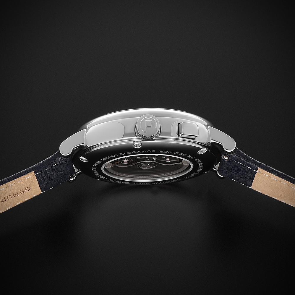 PRIM Retro Elegance 2025 se vrací k většímu průměru pouzdra, čímž odpovídá přání těch, kdo touží po hodinkách s opravdovou přítomností na zápěstí. V době, kdy se mnohé značky přiklání k menším rozměrům, si PRIM dovoluje jít proti proudu – a právě proto je tento model tak unikátní. Větší rozměr není jen vizuální výhodou, ale stává se symbolem jistoty a sebevědomí.