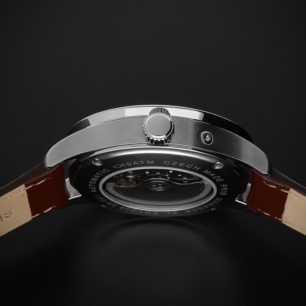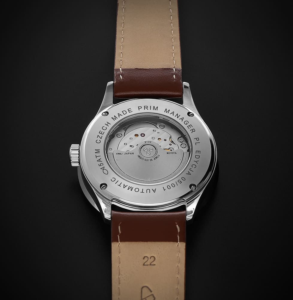 • Funkce a popis:Čas, datum, den v týdnu a měsíce v roce - vše v češtině, mechanický strojek s automatickým nátahem Japan MIYOTA 9122 (26 kamenových uložení) = rezerva chodu až 40 hodin, polokmity setrvačky 28.800/h (3 Hz) = přesnost chodu (diference) 2 - 4 vteřin denně, automatický nátah (hodinky se natahují pohybem ruky) + ruční nátah (hodinky lze natáhnout/dotáhnout dle potřeby i ručně korunkou), zapínání - motýlková spona, průhledné zadní víčko pro náhled na strojek