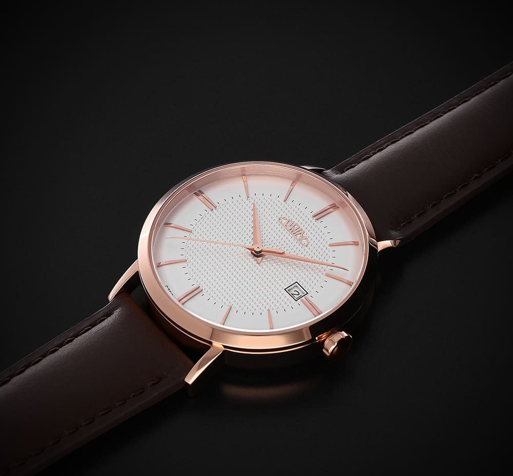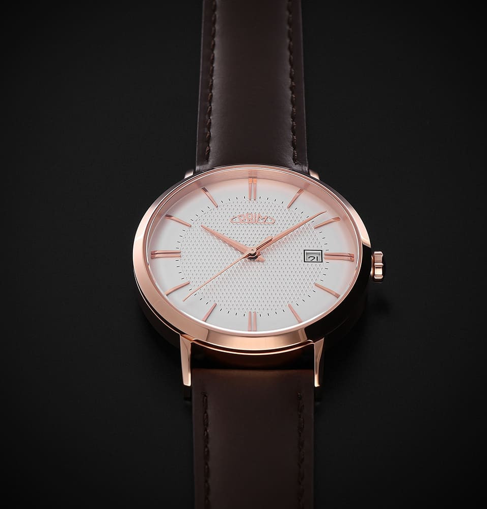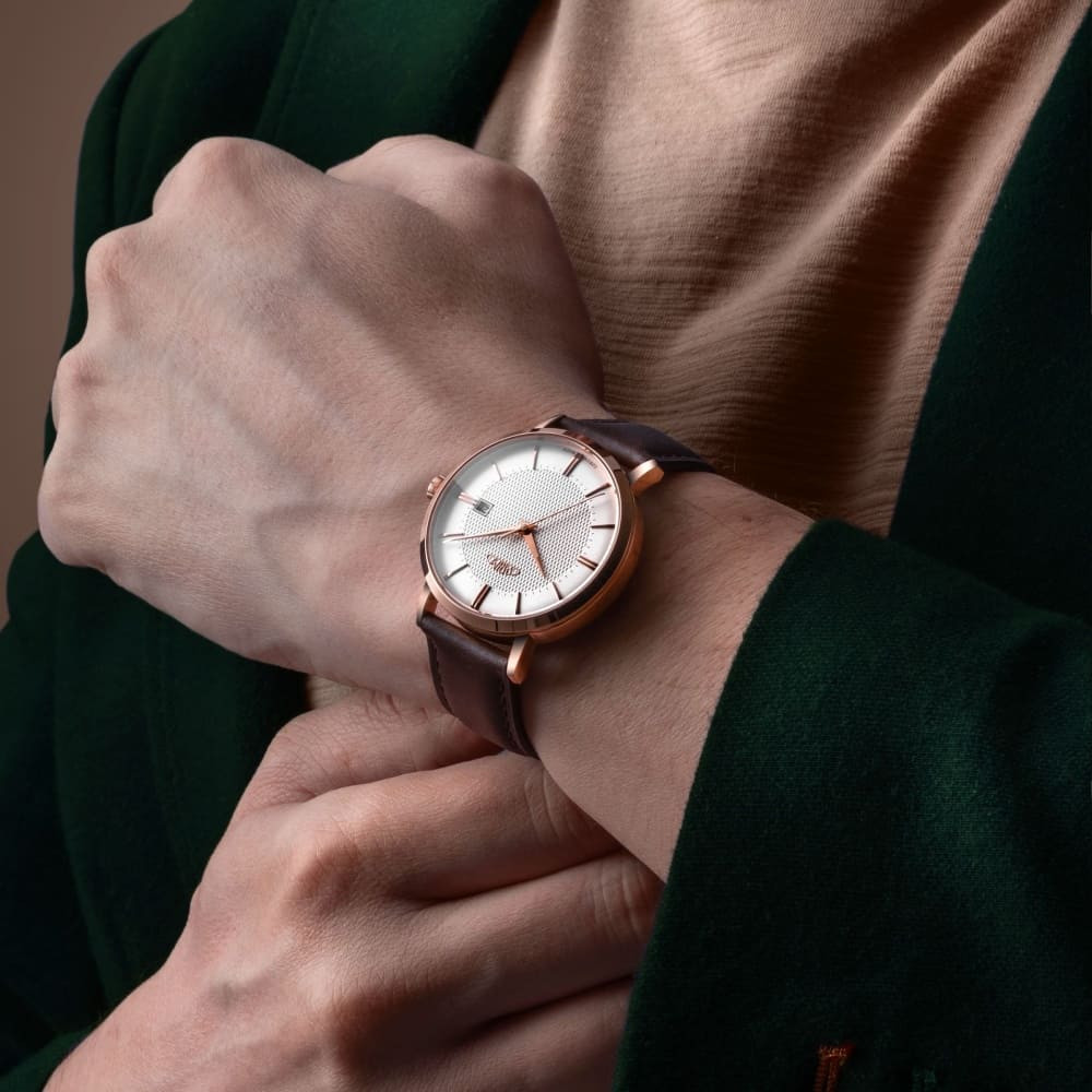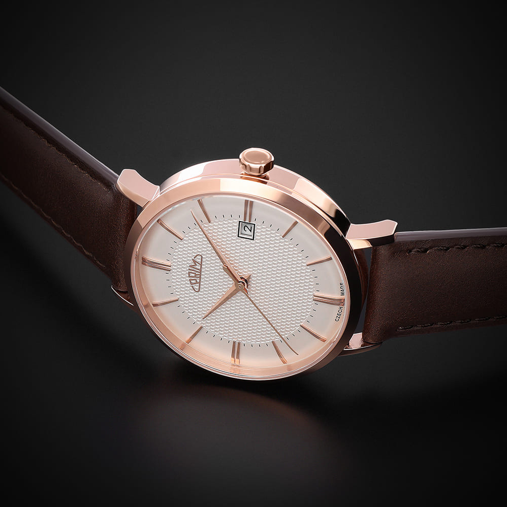 PRIM Tempo Essence - D W01P.13261.D jsou automatické hodinky, které osloví zákazníka se smyslem pro jemnou eleganci a teplejší kovové tóny. Tato varianta pracuje s velmi vytříbenou kombinací růžově zlatého pouzdra, stříbrného číselníku s akcenty růžového zlata a tmavě hnědého koženého řemínku. Celek působí měkce, noblesně a velmi kultivovaně, aniž by sklouzával k okázalosti. Řada Tempo Essence je inspirována jemnými modely šedesátých let a právě tato reference patří k nejklasičtějším ...