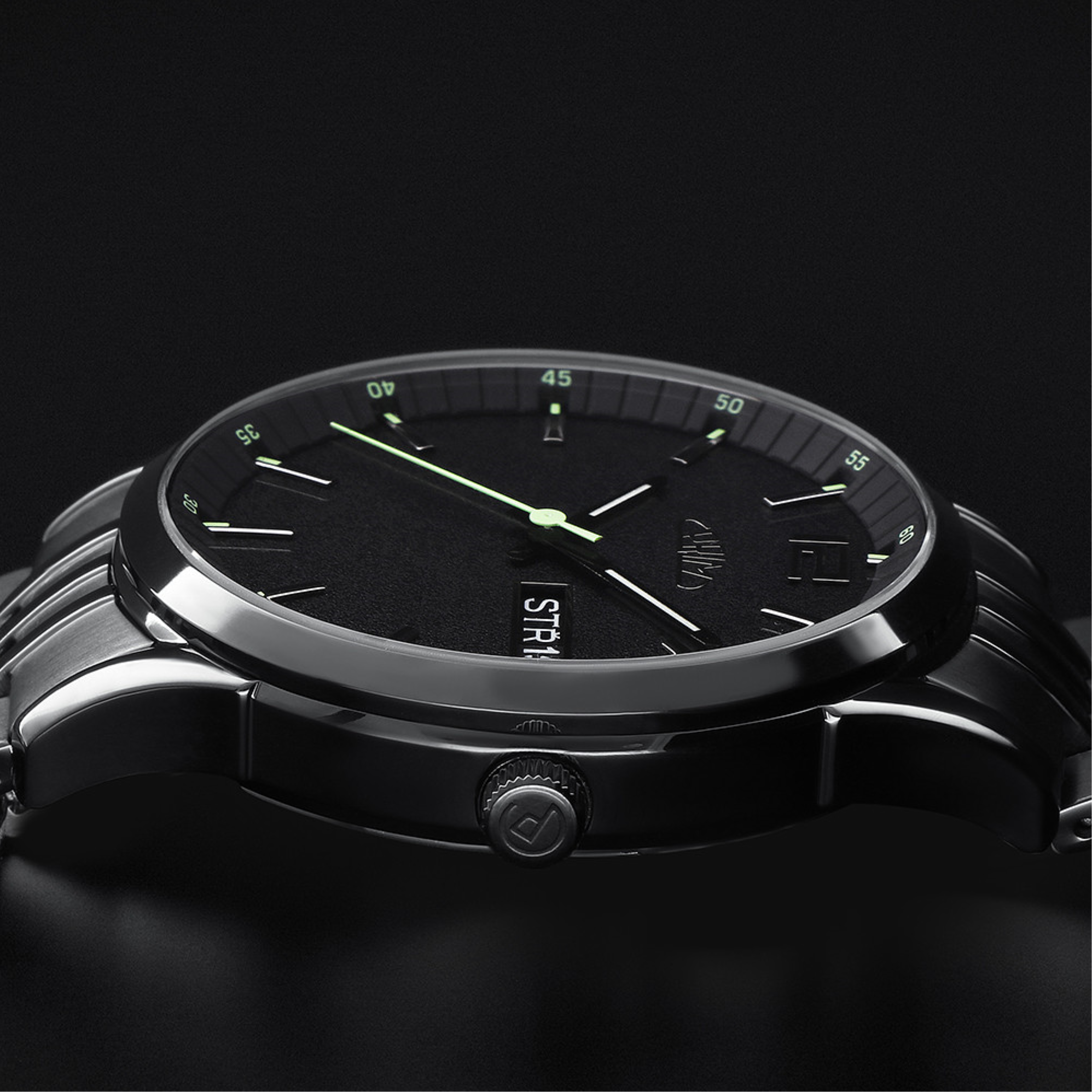 Máme-li hodinky bez šroubovací korunky s korunkou klasicky zastrčenou (obr. 2.), v této zastrčené pozici je poloha "volná", kdy můžeme otáčet s korunkou libovolně na jakoukoliv stranu bez žádného účinku. Povytažením korunky řídíme datum rychloposuvem a v druhé poloze si řídíme ručičky.