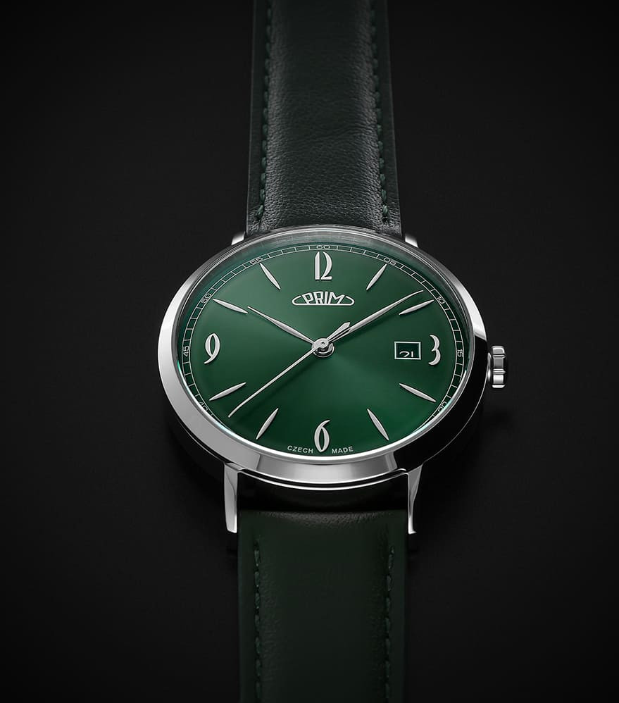 PRIM Noble - B W01P.13254.B jsou automatické hodinky, které staví na noblese inspirované 60. lety a na čistých liniích, jež se hodí k obleku i k volnočasové košili. Zelený číselník s paprskovitou strukturou působí elegantně, ale zároveň zůstává přehledný díky kombinaci arabských číslic, indexů a minutové stupnice. Praktické datum doplňuje každodenní použitelnost a vystouplé 3D číslice přidávají jemný plastický efekt, který vynikne při dopadu světla.