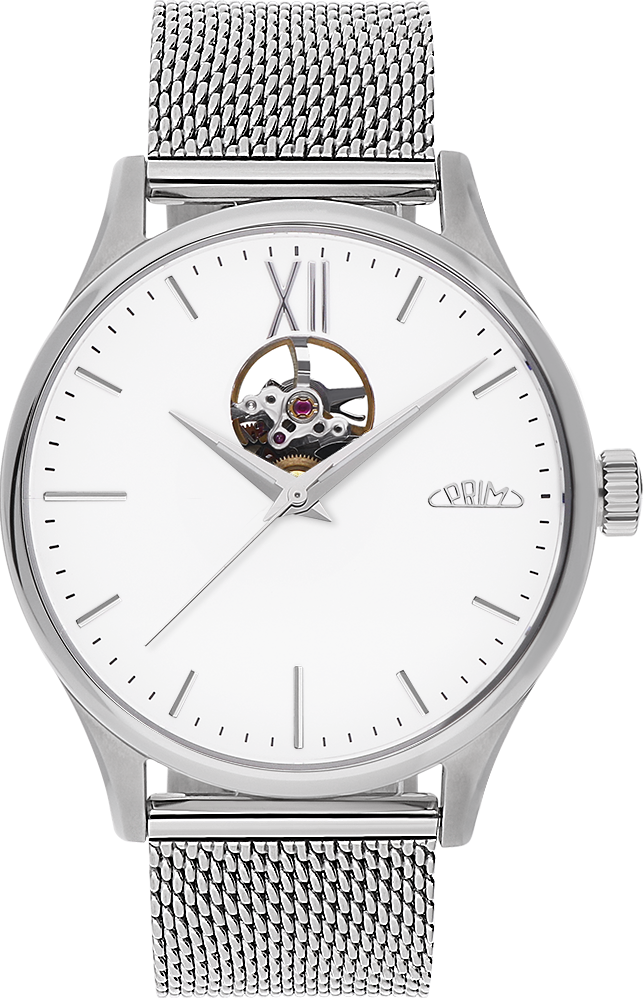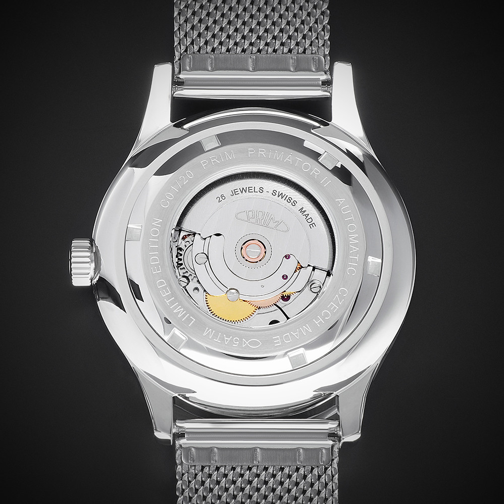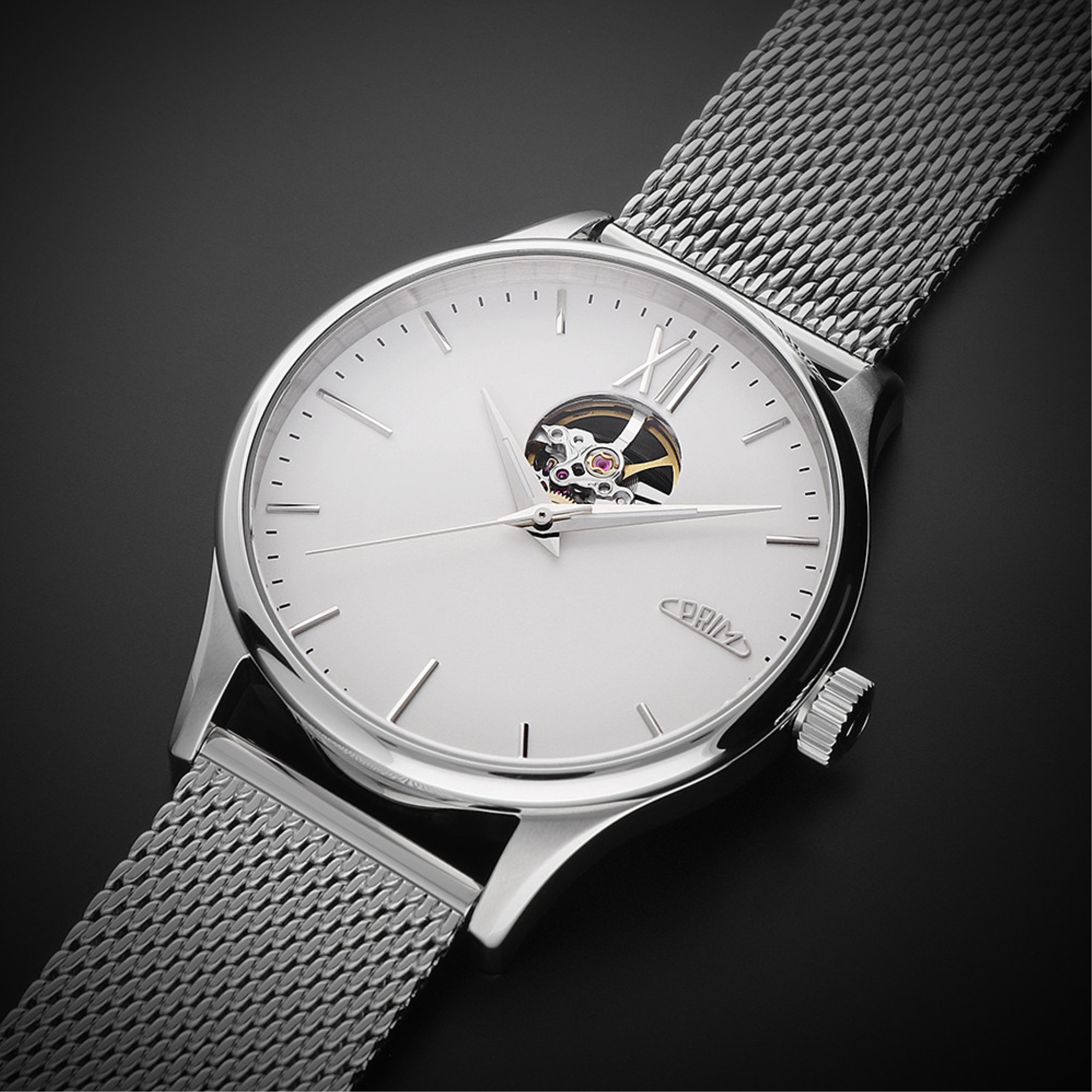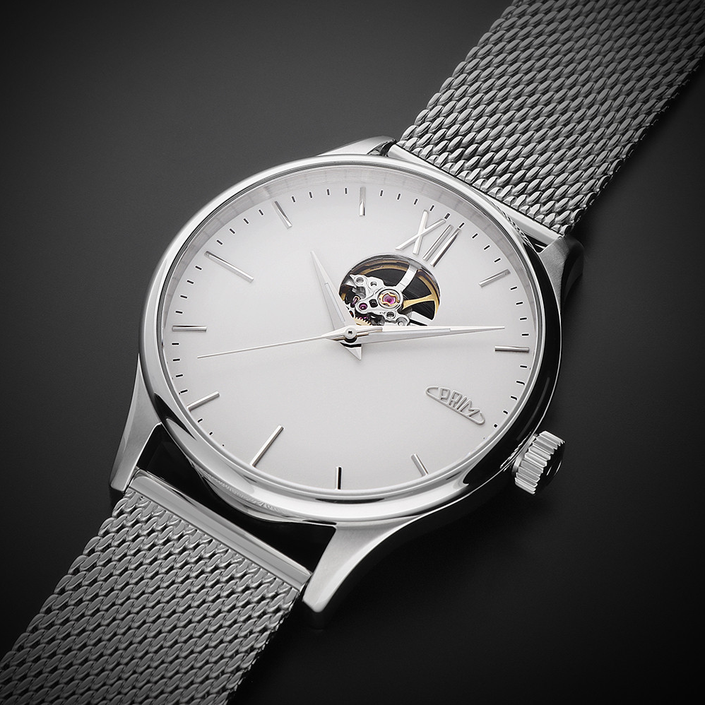 Pánské luxusní hodinky PRIM Primátor II ve speciální sérii 80 kusů. Exkluzivní hodinky inspirované klasickým a moderním designem s netradičním průzorem v horní části číselníku.