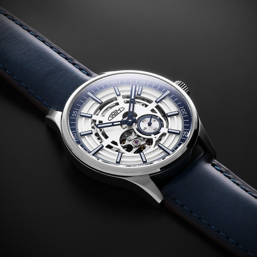 • Funkce a popis:Čas, mimostředná vteřinová ručka, mechanický japonský strojek s automatickým nátahem - kalibr 8N40 s rezervou až 42 hodin, polokmity setrvačky 21.600/h (4 Hz) = 3 - 5 vteřiny denně, skeletonový číselník, luminiscenční ručky