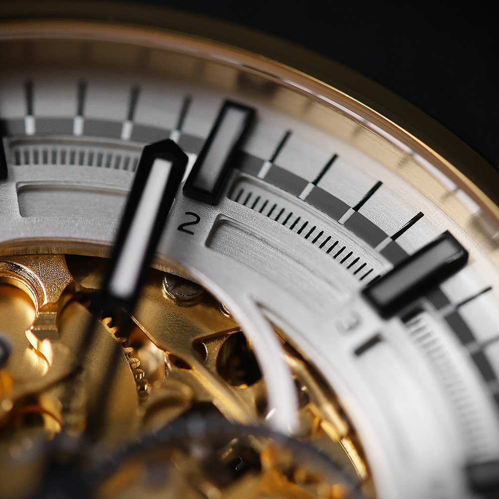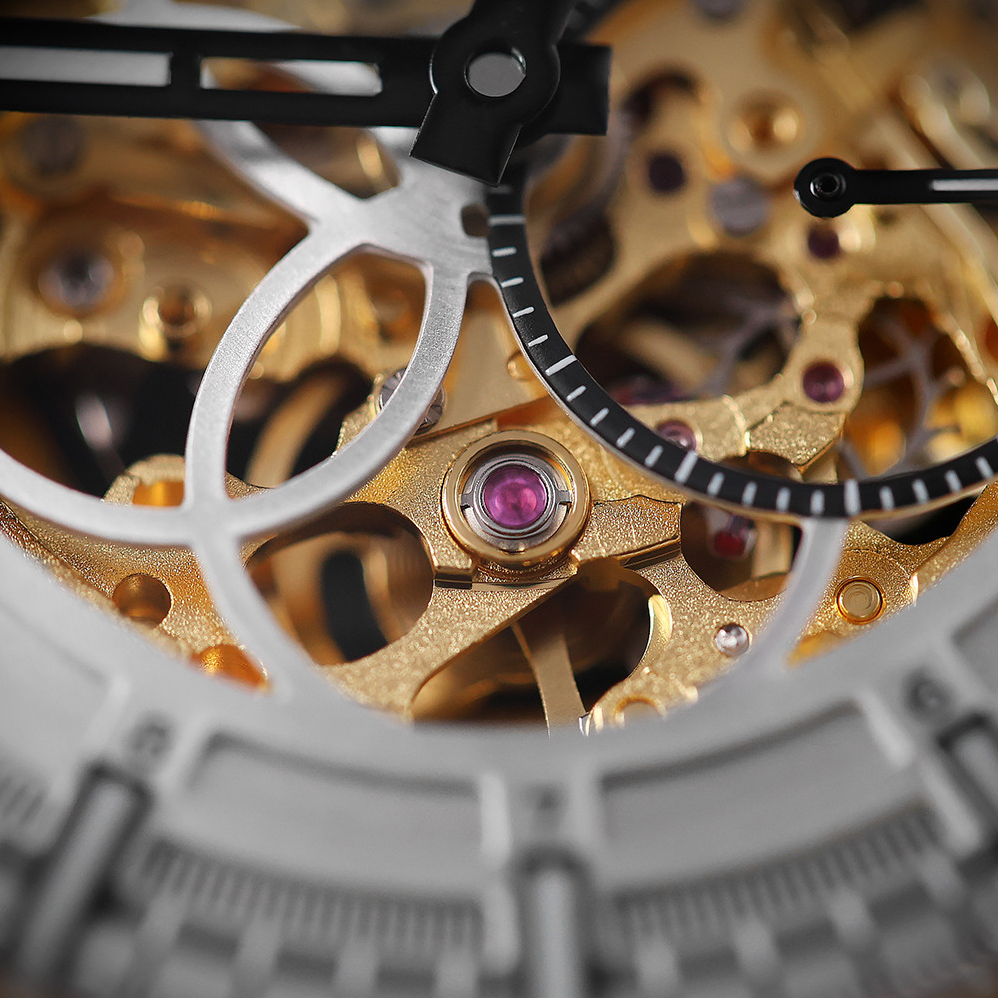 • Funkce a popis:Čas, mimostředná vteřinová ručka, mechanický japonský strojek s automatickým nátahem - kalibr 8N40 s rezervou až 42 hodin, polokmity setrvačky 21.600/h (4 Hz) = 3 - 5 vteřiny denně, skeletonový číselník, luminiscenční ručky a indexy