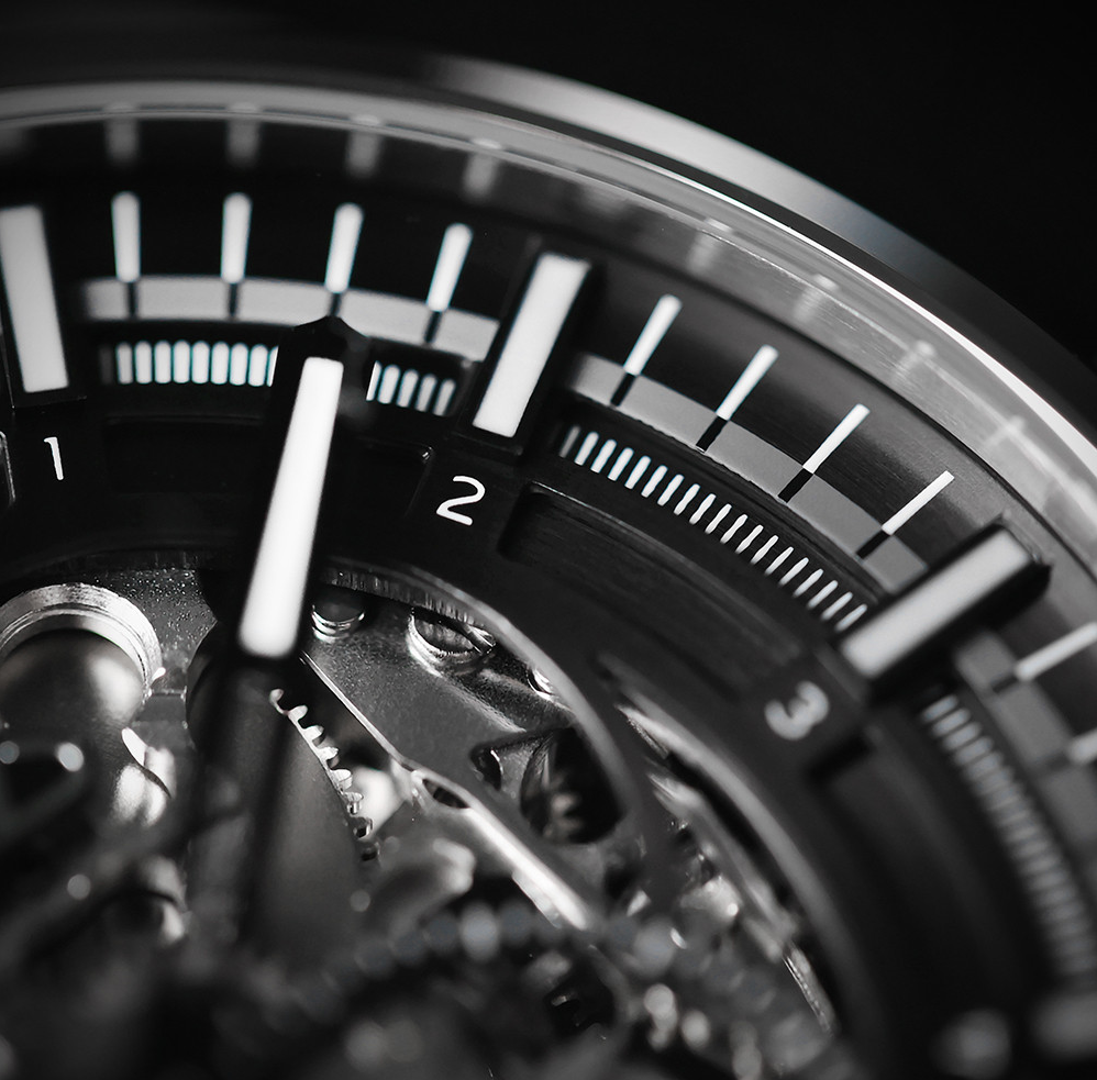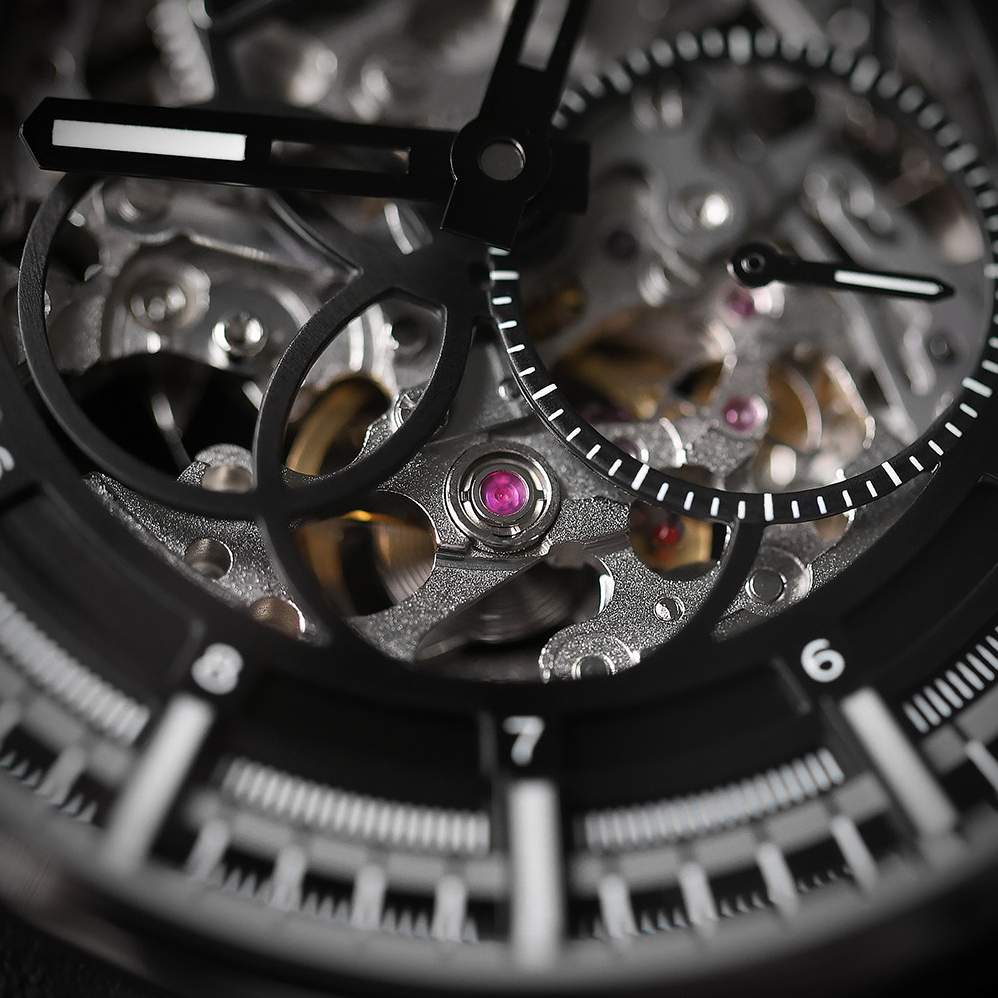 • Funkce a popis:Čas, mimostředná vteřinová ručka, mechanický japonský strojek s automatickým nátahem - kalibr 8N40 s rezervou až 42 hodin, polokmity setrvačky 21.600/h (4 Hz) = 3 - 5 vteřiny denně, skeletonový číselník, luminiscenční ručky a indexy
