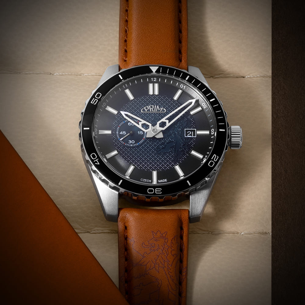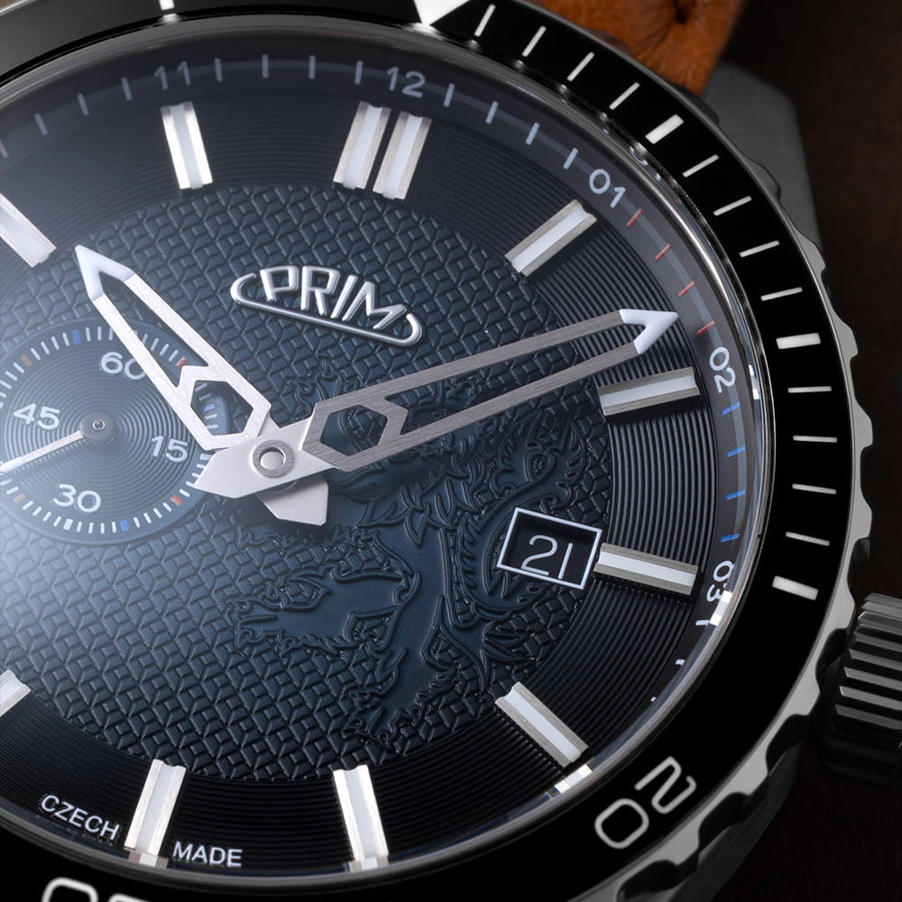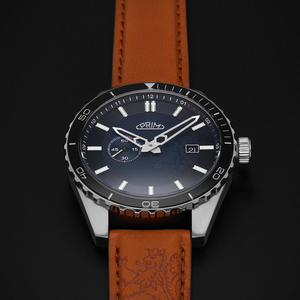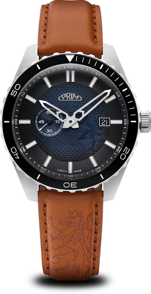 PRIM Symbol LE - A W91P.13267.A je limitovaná edice, která staví na silné národní symbolice - motiv českého lva se objevuje na číselníku, víku i rotoru. Díky tomu působí hodinky nejen jako precizní časomíra, ale i jako výrazný sběratelský kus. Edice je striktně omezená na 50 kusů, takže každý exemplář má jasnou hodnotu exkluzivity. Charakter modelu podporují také detaily s luminiscencí, které zůstávají čitelné i ve chvílích, kdy okolní světlo nestačí.