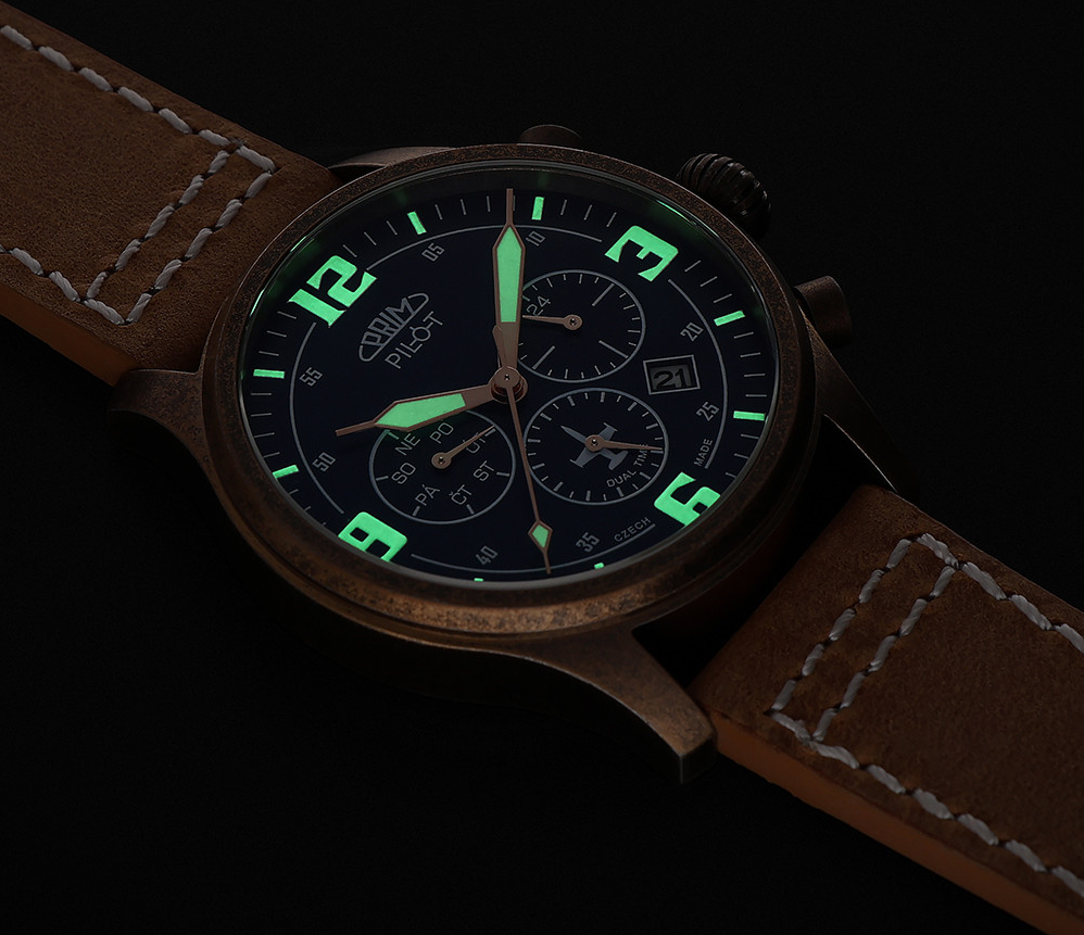• Funkce a popis:Čas, datum, české dny v týdnu, duální čas, šroubovací korunka s vodotěsností 10 ATM, 0.1 mm silné japonské luminiscenční pilotní ručičky a indexy, vylepšený japonský kalibr JP75 s výdrží baterie až 8 let