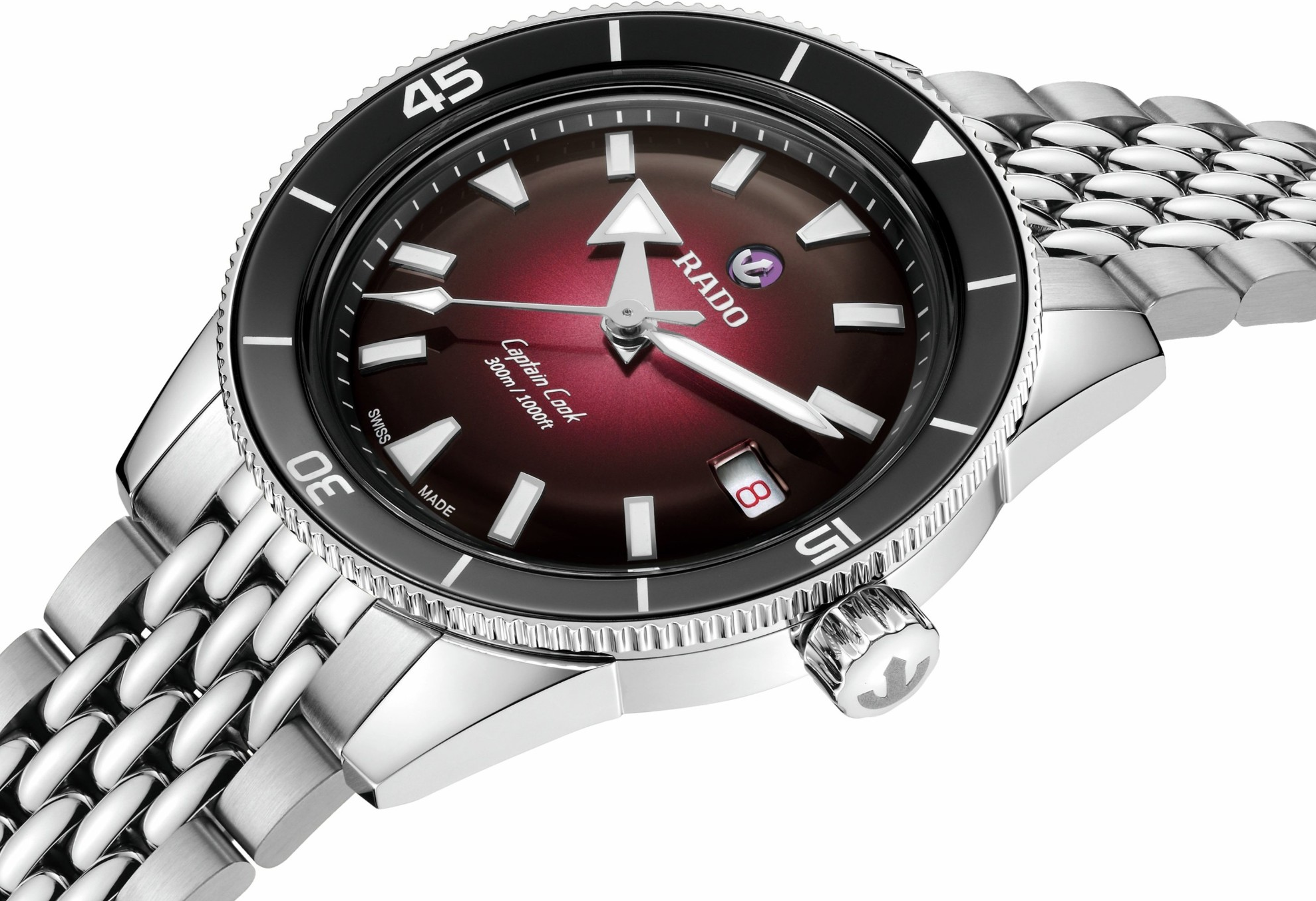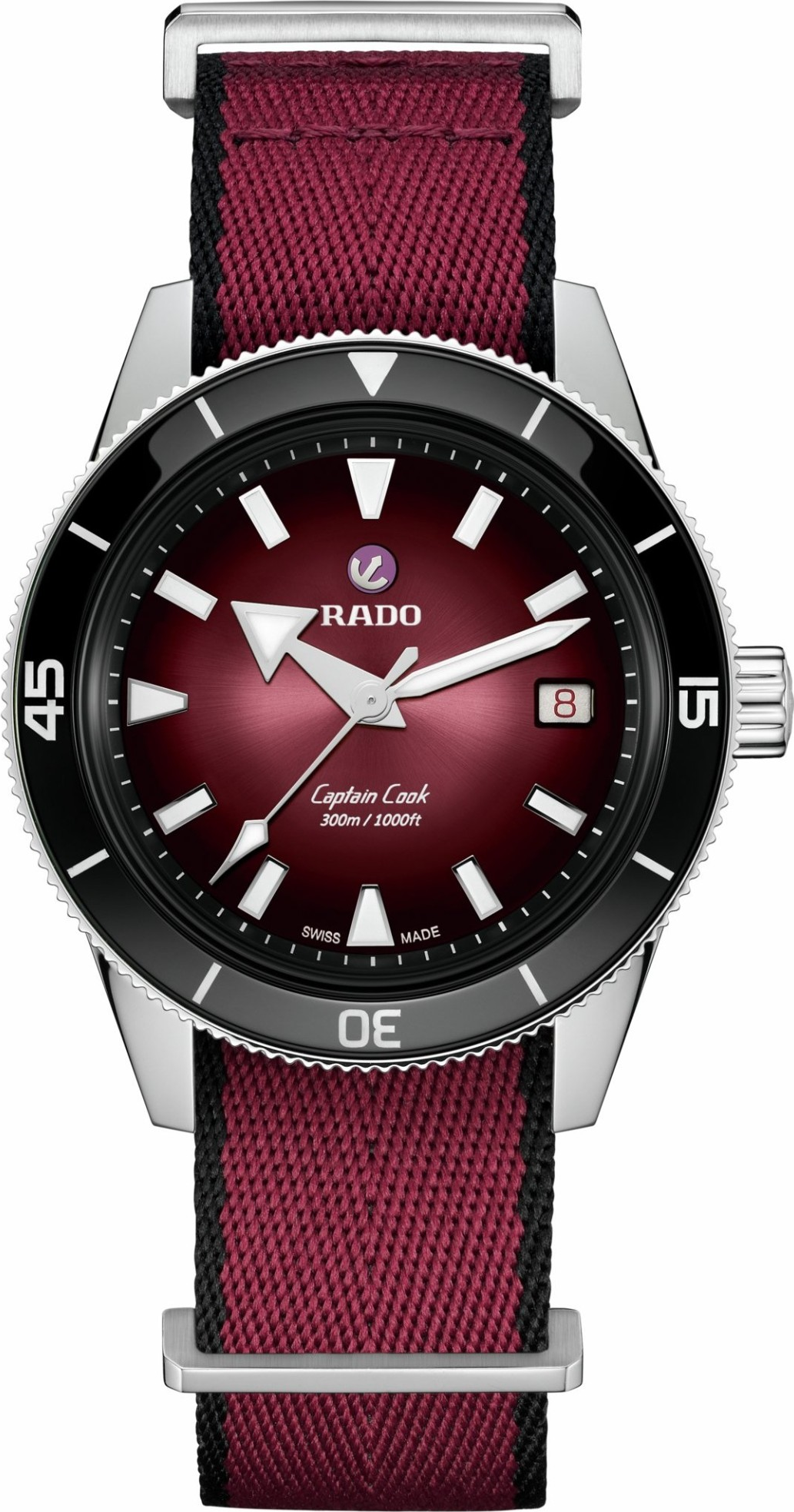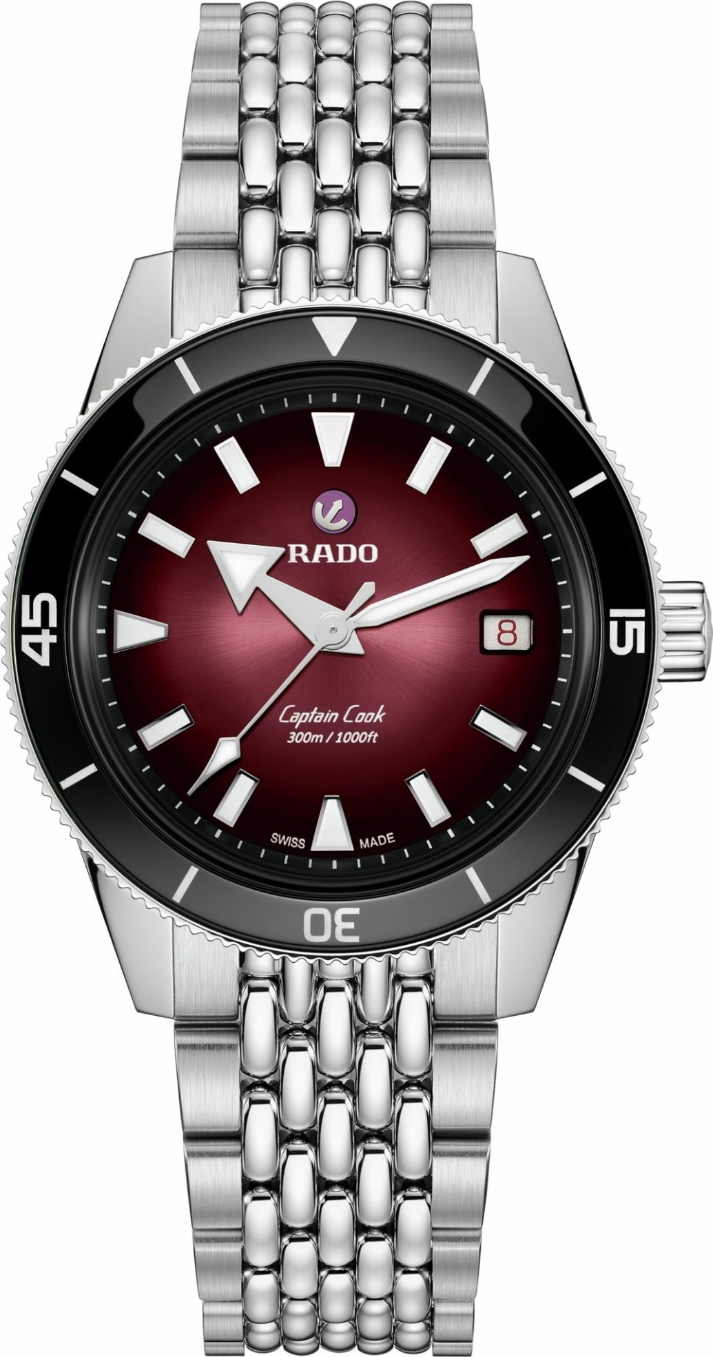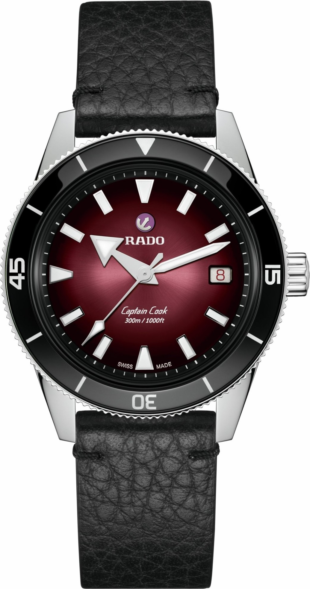 Rado Captain Cook Automatic R32223408 je sportovně laděný model inspirovaný původní edicí z roku 1962, který vyniká kombinací vintage detailů a moderní techniky. Na první pohled zaujme černý - červený přechodový číselník (black-to-burgundy efekt), jenž pod světlem mění hloubku odstínů a podtrhuje charakter řady Captain Cook. Praktickou výbavou je datumový průhled, díky kterému máš přehled i v běžném pracovním režimu, aniž by design působil přeplácaně.
