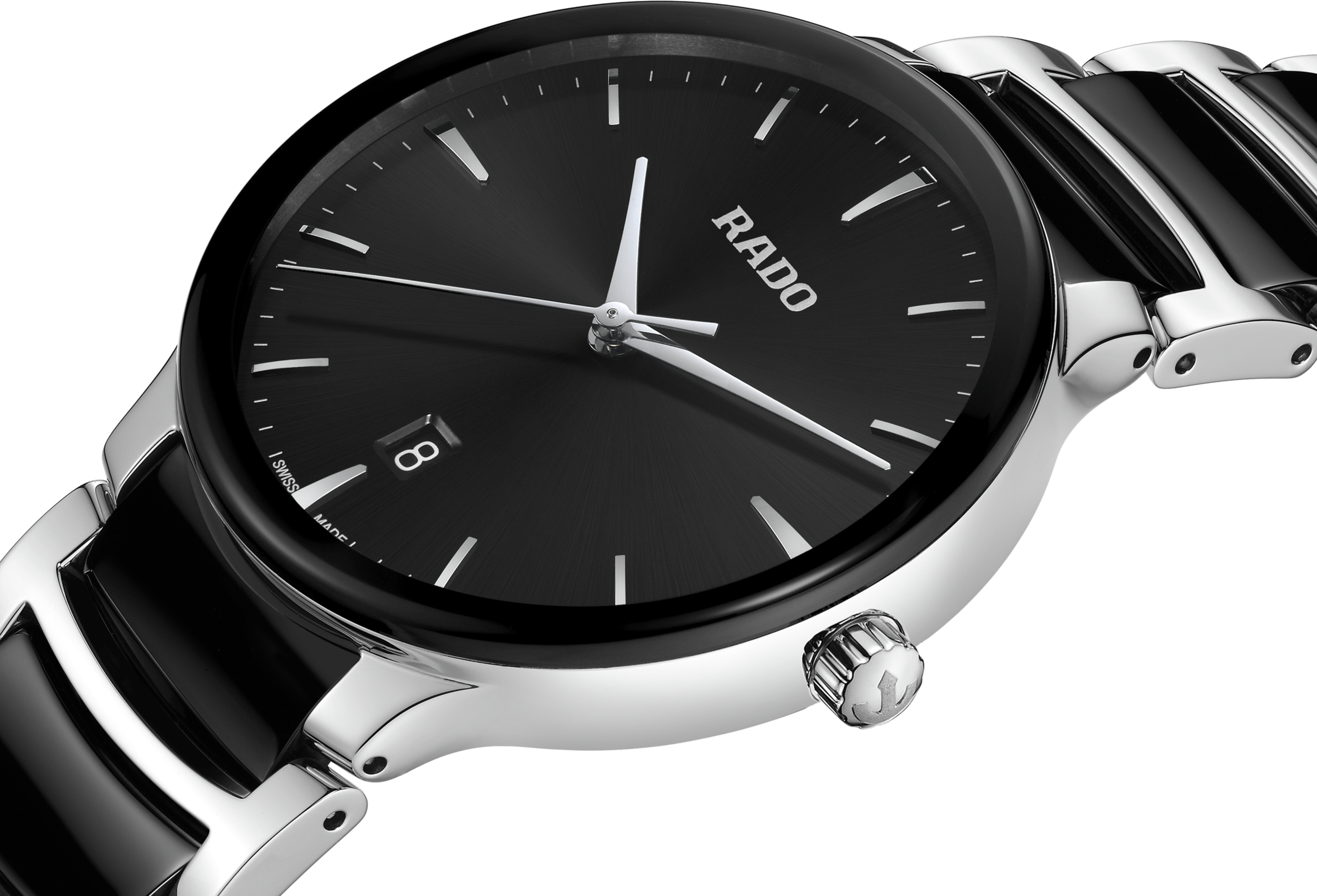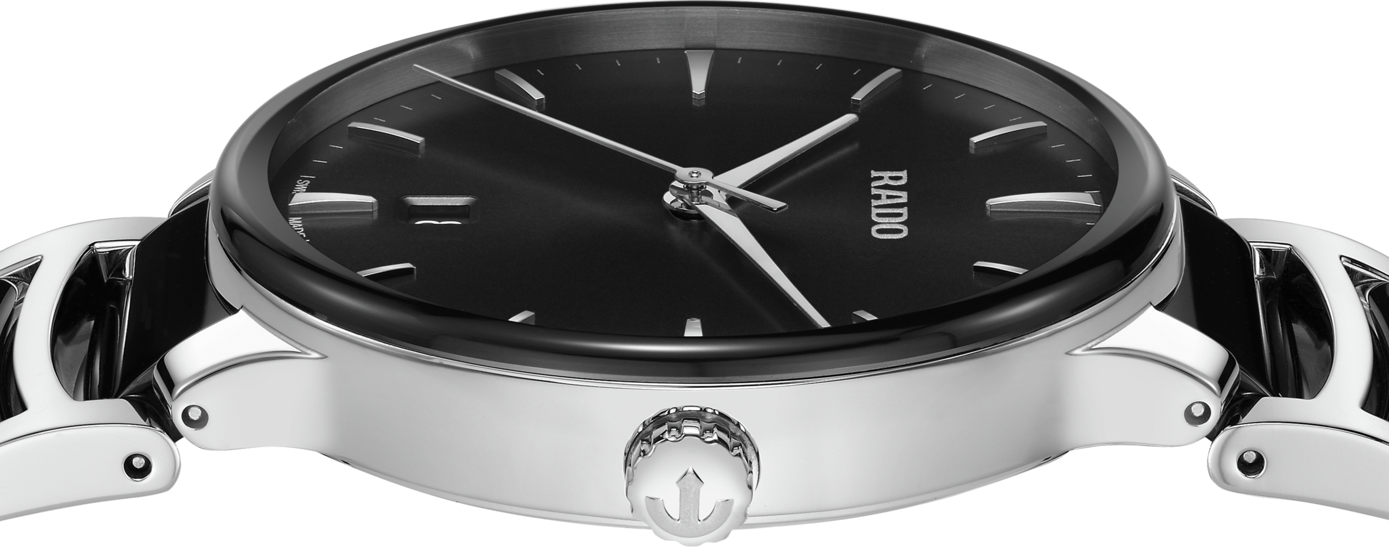 Klasický Centrix Quartz byl přepracován nejen technicky, ale i esteticky. Upravený model R30021152 má zaoblené safírové sklíčko, které zasahuje až k okraji, a zakřivené pouzdro splývající se zakřiveným okrajem krystalu. Upravené ouška pouzdra a náramek z leštěné nerezové oceli s černými high-tech keramickými středními články dotvářejí celkový vzhled těchto ikonických hodinek. Černý sluneční číselník s aplikovanými indexy v barvě rhodia dokonale ladí s ručičkami v barvě rhodia.