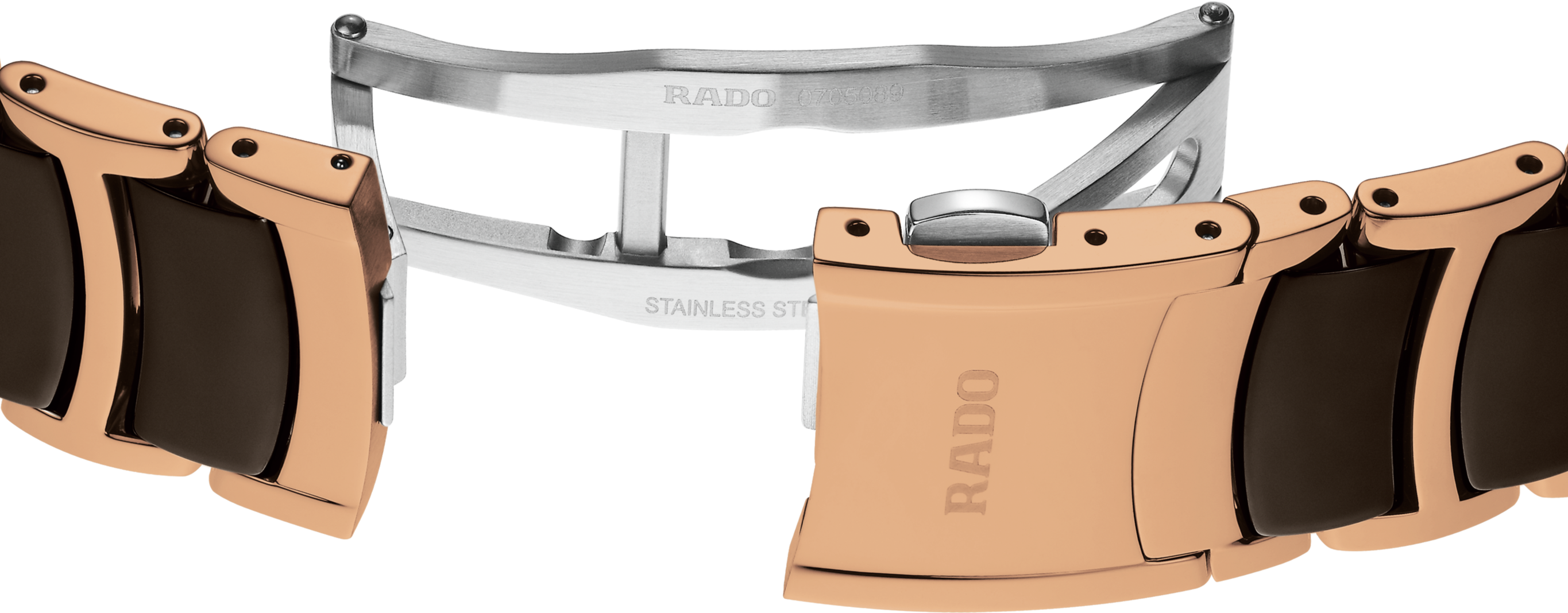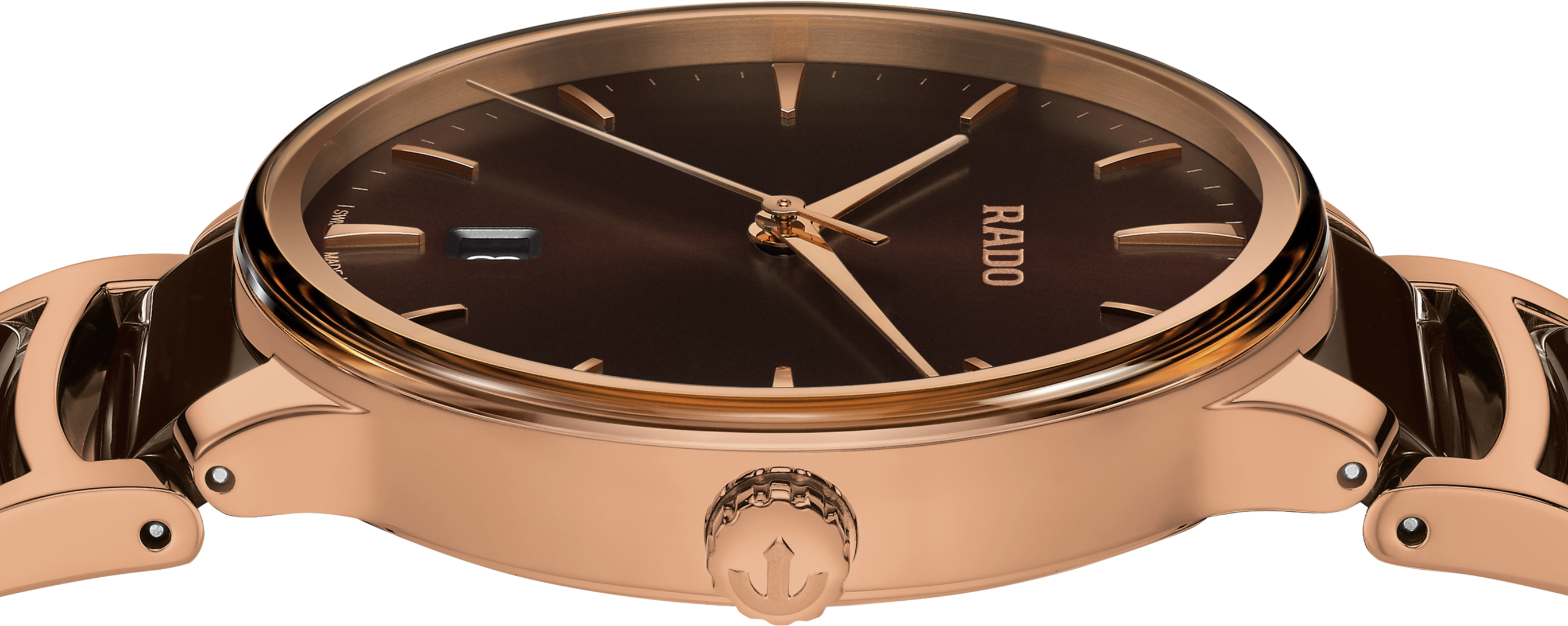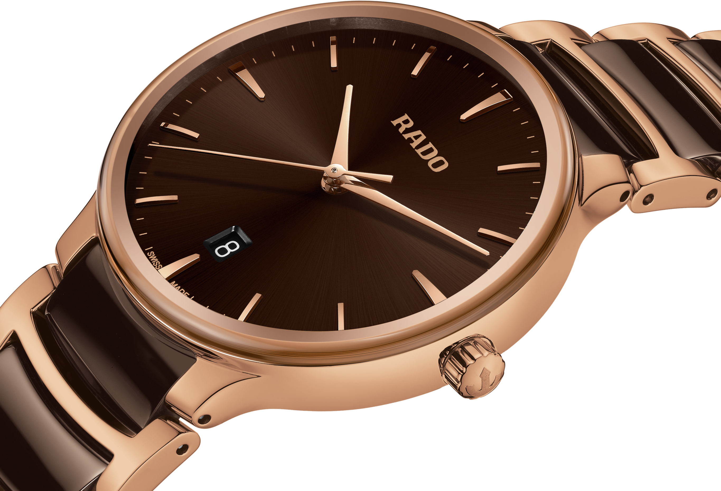 Klasický Centrix Quartz byl přepracován nejen technicky, ale i esteticky. Upravený model R30023302 má zaoblené safírové sklíčko, které zasahuje až k okraji, a zakřivené pouzdro splývající se zakřiveným okrajem krystalu. Celkový vzhled těchto ikonických hodinek dotvářejí upravené ouška pouzdra a náramek z leštěné nerezové oceli s PVD povlakem v barvě růžového zlata s hnědými high-tech keramickými středními články.  ...