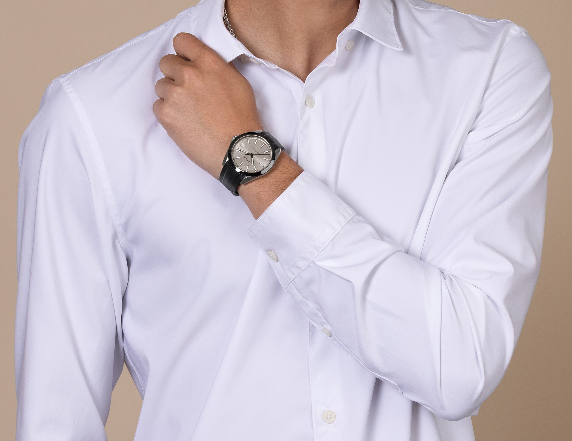 Rado HyperChrome R32280109 jsou švýcarské hodinky, které zaujmou velmi čistou kombinací ocelového pouzdra, černé keramické lunety a sportovně laděného pryžového řemínku. Tento model z kolekce HyperChrome působí technicky, moderně a přitom stále dostatečně elegantně pro běžné denní nošení. Rhodiovaný sluneční číselník přináší svěží kovový výraz a vytváří výrazný kontrast vůči černě PVD upraveným ručkám a indexům. Díky tomu je design výrazný, ale nepůsobí těžce. Bílé ...
