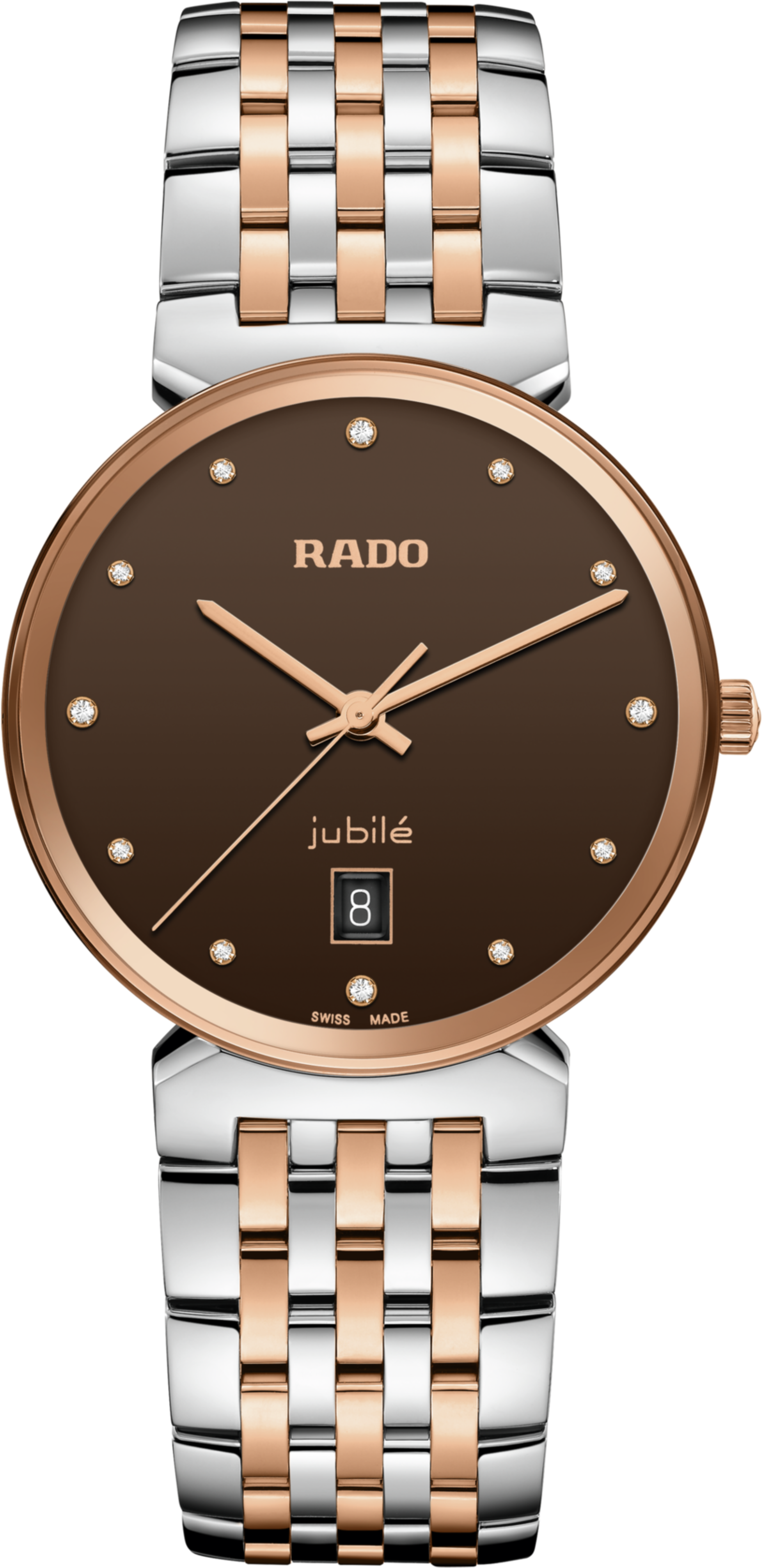Harmonický design Rado Florence Classic připomíná elegantní dómy a věže města, podle kterého je kolekce pojmenována. 38mm hodinky mají zaoblené safírové sklíčko zkosené od okraje k okrajiPouzdro, luneta, korunka a náramek jsou vyrobeny z leštěné nerezové oceli, luneta a dílky článků jsou povrchově upravené velmi tvrdým, otěruodolným povrchem PVD v odstínu růžového zlata