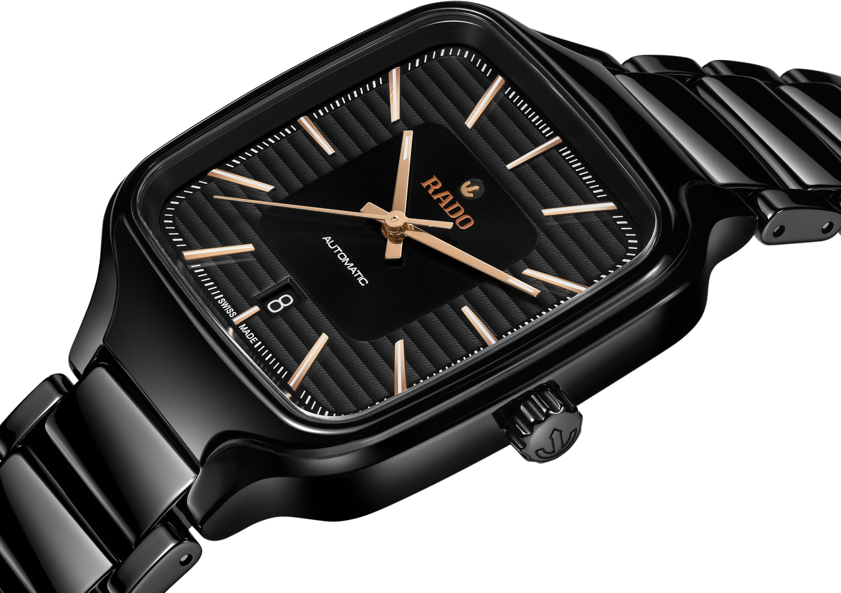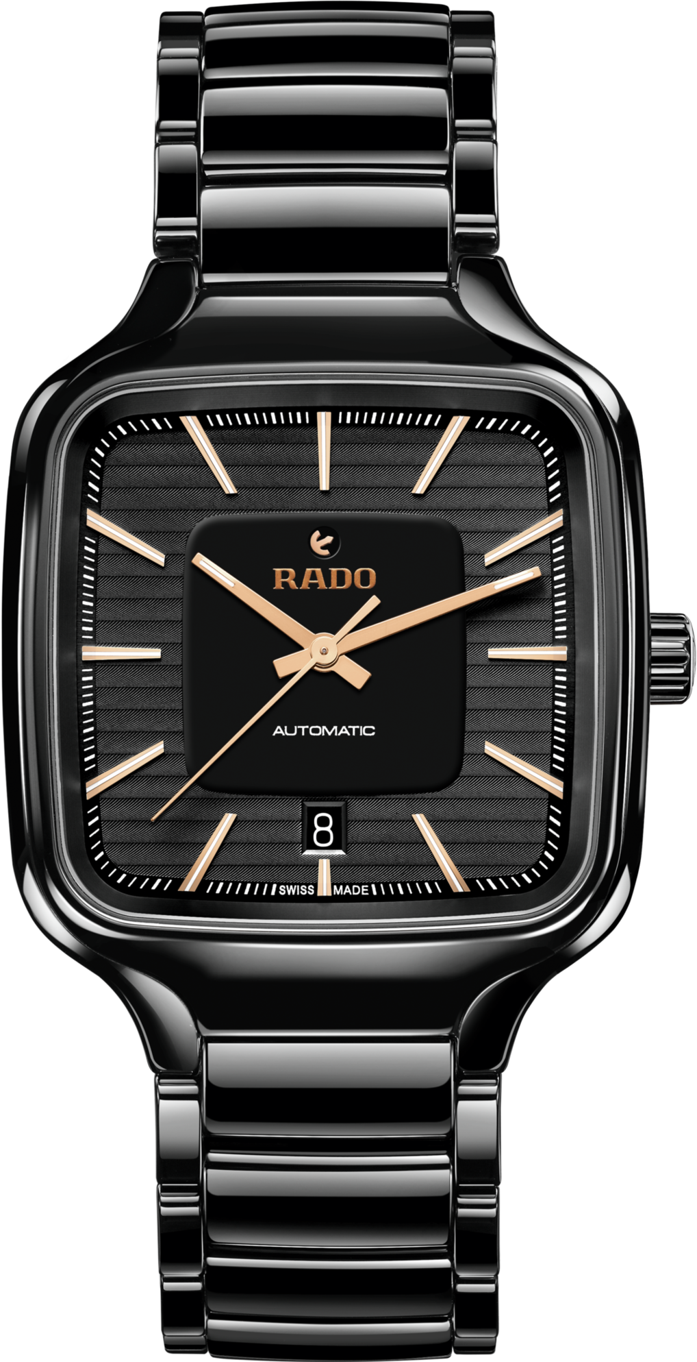 Kolekce Rado True Square R27078172 má průměr 38 mm a skládá se z leštěného černého high-tech keramického pouzdra a korunky a safírového sklíčka. Růžově zlaté ručičky a indexy s bílým Super-LumiNova® dokonale ladí s číselníkem, který obsahuje černě vyraženou horizontální strukturu.