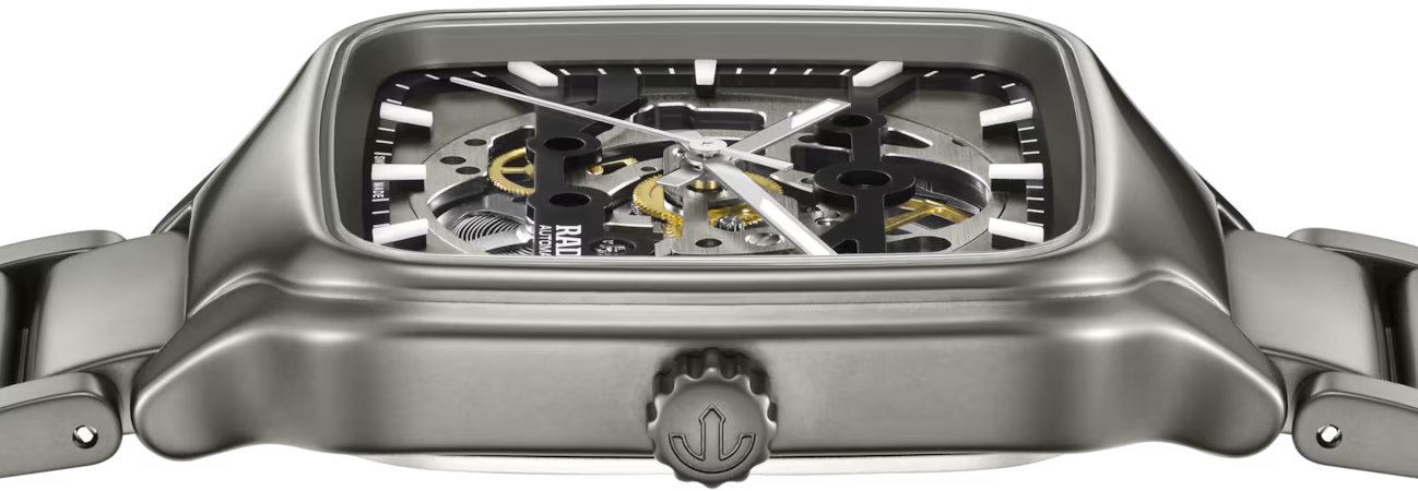 Rado True Square Skeleton je ukázkou toho, jak se dá propojit špičková high-tech keramika s mimořádně precizním švýcarským hodinářským uměním. Uvnitř 38mm matného plazmově keramického pouzdra z jednoho kusu pracuje strojek R808 s 25 kameny a rezervou chodu 80 hodin