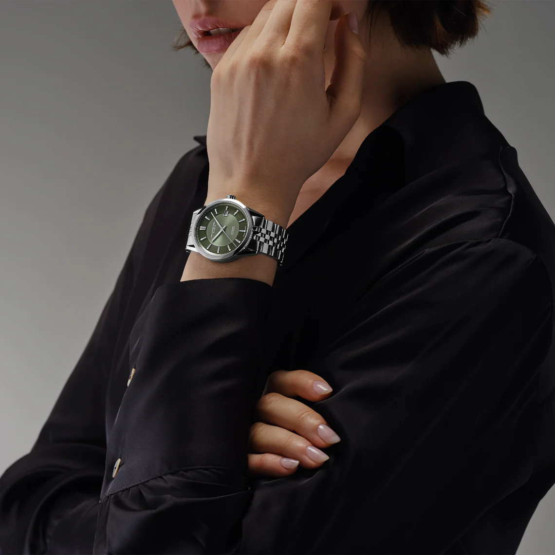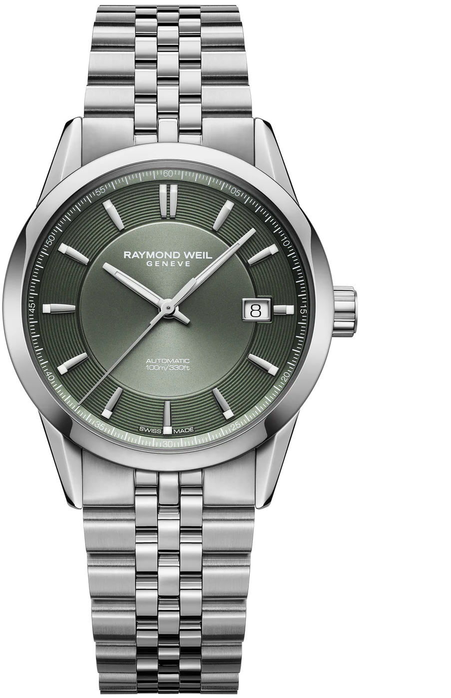 Model Raymond Weil freelancer 2771-ST-52051 představuje velmi atraktivní pánské automatické hodinky, které spojují čistou švýcarskou eleganci s moderním barevným akcentem a vysokou každodenní použitelností. Tato reference z kolekce freelancer zaujme na první pohled svým olivově zeleným číselníkem, který působí živě, kultivovaně a současně velmi nadčasově. Právě tento odstín dodává hodinkám osobitost, aniž by narušoval jejich univerzální charakter. Datum na pozici ...