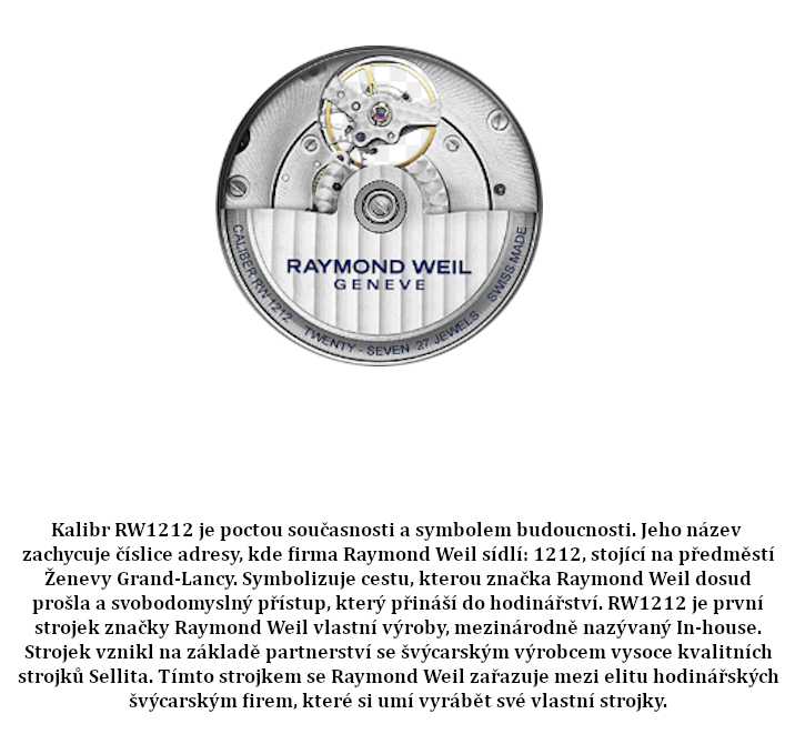 • Funkce a popis::Čas, otevřené srdce strojku, strojek swiss Raymond Weil RW 1212 - rezerva chodu 38 hodin, kmity setrvačky 28.800/h = diference 3 - 4 vteřiny denně, korunka pouzdra s logem RW (Raymond Weil), průhledné zadní víčko pro náhled na strojek, svítící ručky a indexy