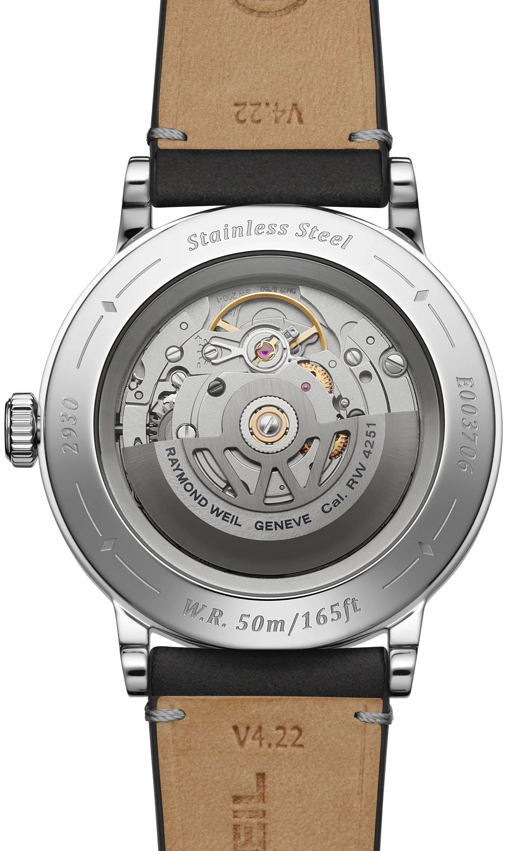 • Funkce a popis:Čas, strojek Swiss Raymond Weil RW4251 = rezerva chodu 41 hodin, 26 kamenových uložení, polokmity setrvačky 28.800/h (4 Hz)  = diference 2 - 4 vteřiny denně,  automatický nátah (hodinky se natahují pohybem ruky) + ruční nátah (hodinky lze natáhnout/dotáhnout i ručně korunkou), oboustranný nátah rotoru, korunka pouzdra s logem RW (Raymond Weil), průhledné zadní víčko pro náhled na strojek