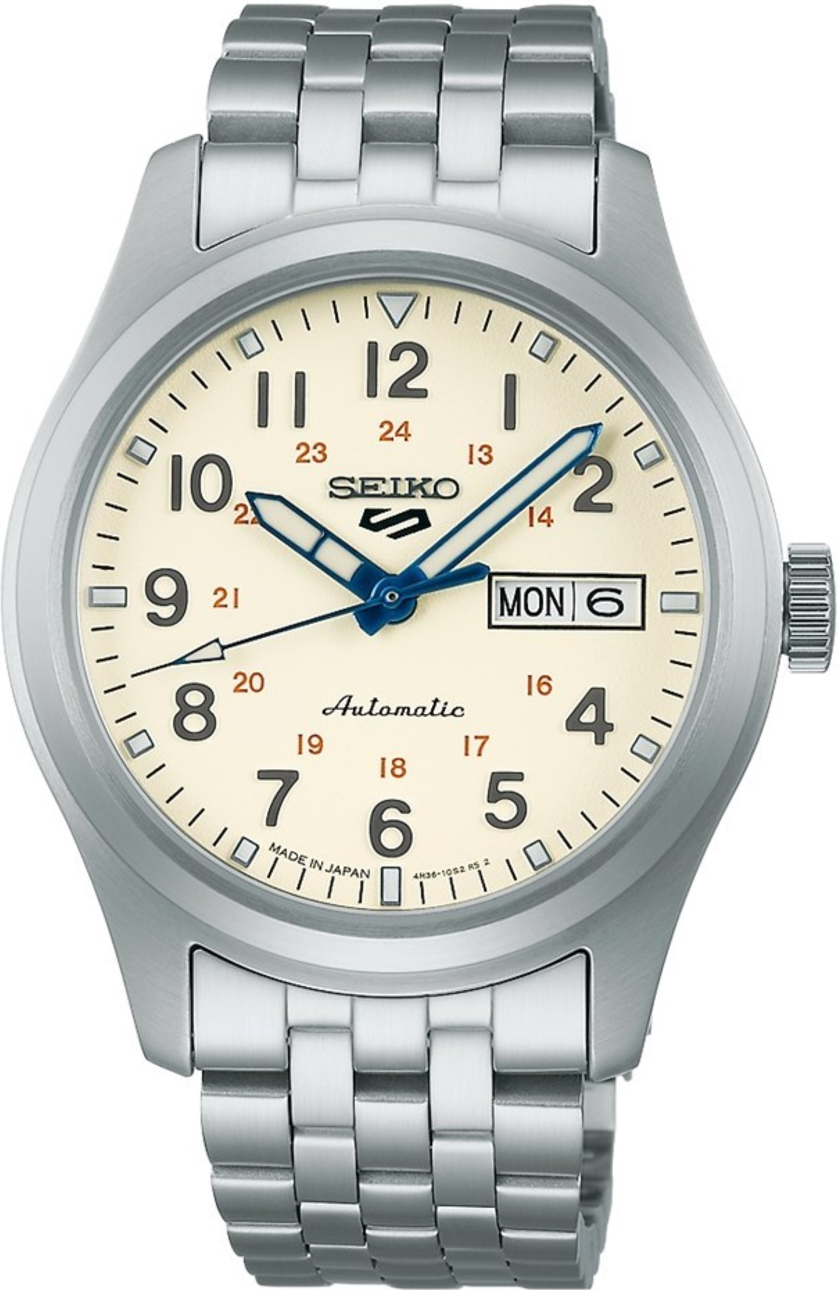 • Funkce a popis:Čas, datum, den v týdnu, strojek vlastní výroby (in-house) automatic Japan Seiko Caliber 4R36 (24 kamenových uložení), rezerva chodu 41 hodin, polokmity setrvačky 21.600/h = přesnost chodu 4 - 7 vteřin denně, vlásek setrvačky - Seiko Spron 510 (odolný vůči otřesům a běžnému magnetickému poli pro stabilní přesnost chodu), materiál hnací pružiny (pera) - Seiko Spron 510 (pero je antimagnetické a po celou dobu své životnosti zachovává stejnou tvrdost a pružnost, což je důležité pro trvalou a konstantní přesnost chodu strojku), hodinky jsou odolné magnetismu o síle 4.800 A/M (60 Gaussům = 5 cm, pro představu - mobilní telefon vzdálen od hodinek 5 cm zasahuje hodinky magnetickým polem o síle 400 A/M a přiblížíme-li hodinky na dotek k telefonu, hodinky zasáhne magnetické pole silou až 16.000 A/M), automatický nátah (hodinky se natahují pohybem ruky) + ruční nátah (hodinky lze natáhnout/dotáhnout i ručně korunkou), rotor samonátahu má oboustranný nátah, regulace přesnosti - ETACHRON (minimální vůle vlásku v zámečku regulační ručky zajišťuje vysokou přesnost hodinek), nárazuvzdor setrvačky Diashock (Seiko) = hodinky jsou již slušně odolné vůči nárazu (otřesu) či pádu, hodinky disponují funkcí strojku "Hacking" (při vytažení korunky do nejzažší polohy pro řízení ručiček se zastavuje vteřinová ručička), ručičky a indexy jsou opatřeny svítící vrstvou LumiBrite (nový druh luminiscenční barvy - od. r. 1995 - který svítí jasněji a déle než běžná luminiscenční vrstva a svítivost slábne v noci velmi pomalu), hodinky splňují normu antimagnetičnosti ISO 764
