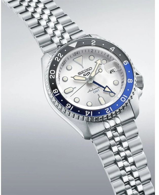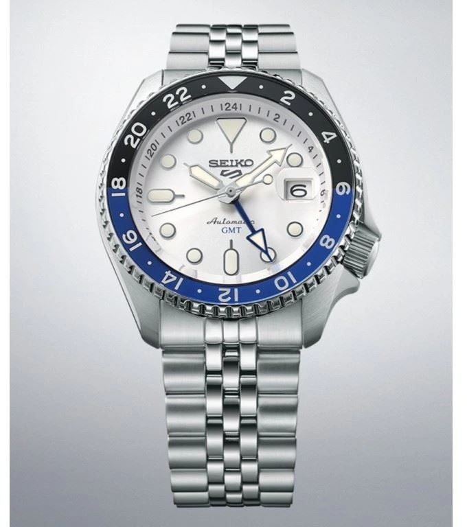 Tento model hodinek Seiko 5 Sports Automatic SSK033K1 GMT Series se inspiruje oblíbeným archivním barevným schématem, které zachytilo scénu modré oblohy prorážející mraky. Kombinace stříbřitě bílého číselníku s tmavě modrým rámečkem je navržena tak, aby připomínala sluneční světlo šířící svou záři po obloze, zatímco funkce GMT sleduje několik časových pásem.