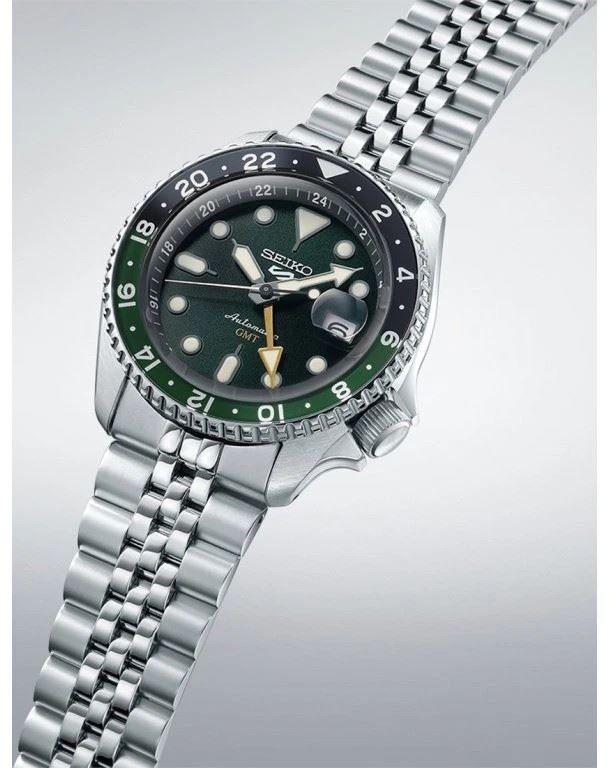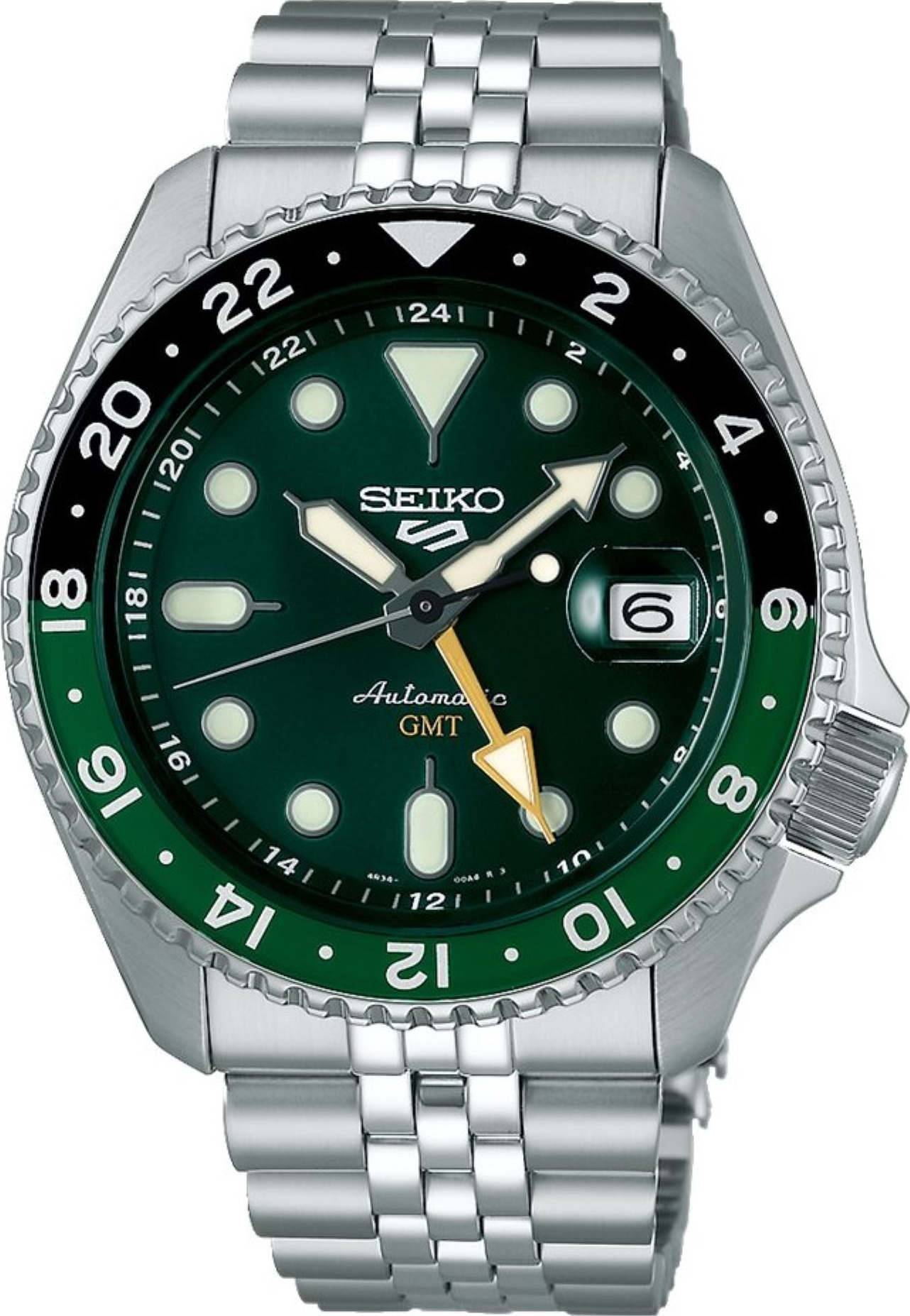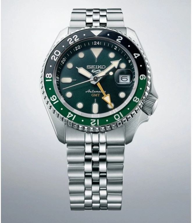 Tento model hodinek Seiko 5 Sports Automatic SSK035K1 GMT Series čerpá inspiraci z oblíbeného archivního barevného schématu v sytě zelené, zatímco jeho funkce GMT sleduje několik časových pásem, otočná luneta je dvoubarevná s černým svrškem.