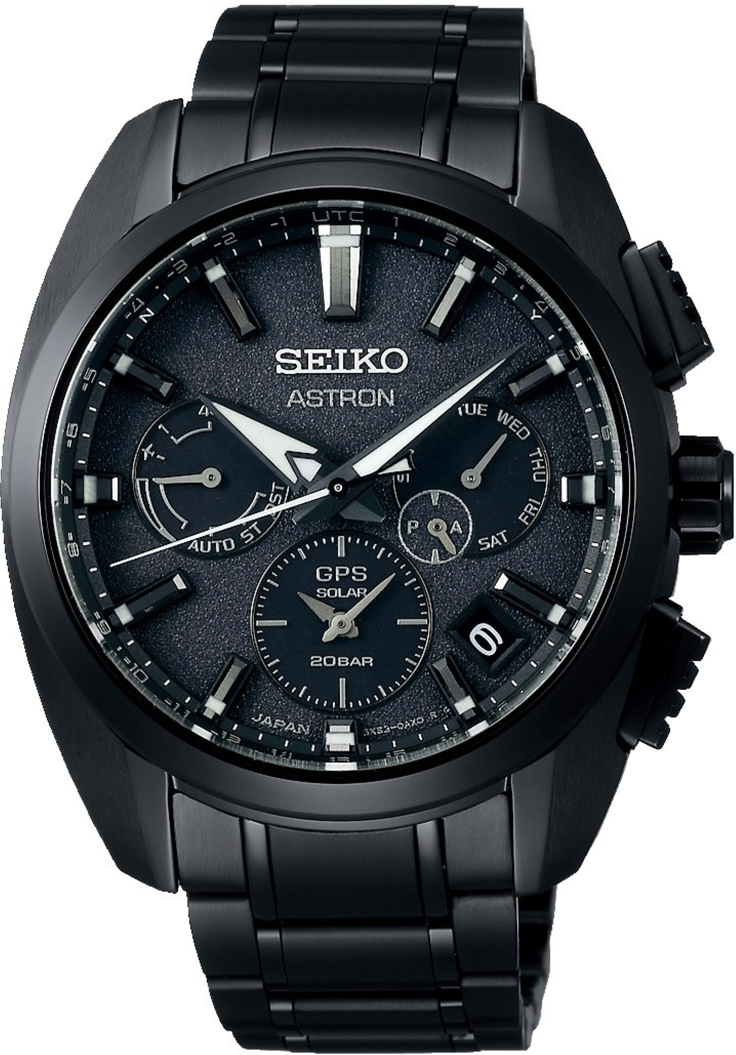 • Funkce a popis:Čas, datum, den v týdnu, solární dobíjení (dobíjení akumulátoru světlem) + řízené GPS (hodinky se seřizují 2x denně pomocí satelitního signálu GPS), strojek Japan Seiko Calibr 5X53, rezerva chodu až 6 měsíců při plném nabití, funkce automatického vyrovnání polohy ruky, DST (letní čas), funkce dvojího času, funkce zabraňující příjmu signálu GPS (letový režim), funkce příjmu signálu GPS (nastavení časového pásma, automatické nastavení času, ruční nastavení času), funkce prevence přebíjení, věčný kalendář do 28. února 2100, zobrazení rezervy chodu, funkce úspory energie, funkce zobrazení výsledku příjmu, funkce zobrazení stavu získání satelitu, funkce přenosu času (přepínání mezi hlavním a dílčím vytáčením), funkce světového času (39 časových pásem)