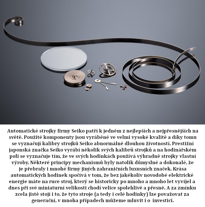 estetické doplnění barevné kombinace hodinek.Automatické strojky firmy Seiko patří k jedněm z nejlepších a nejpřesnějších na