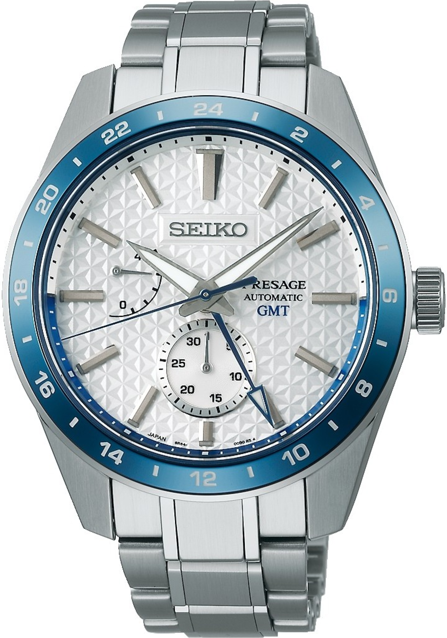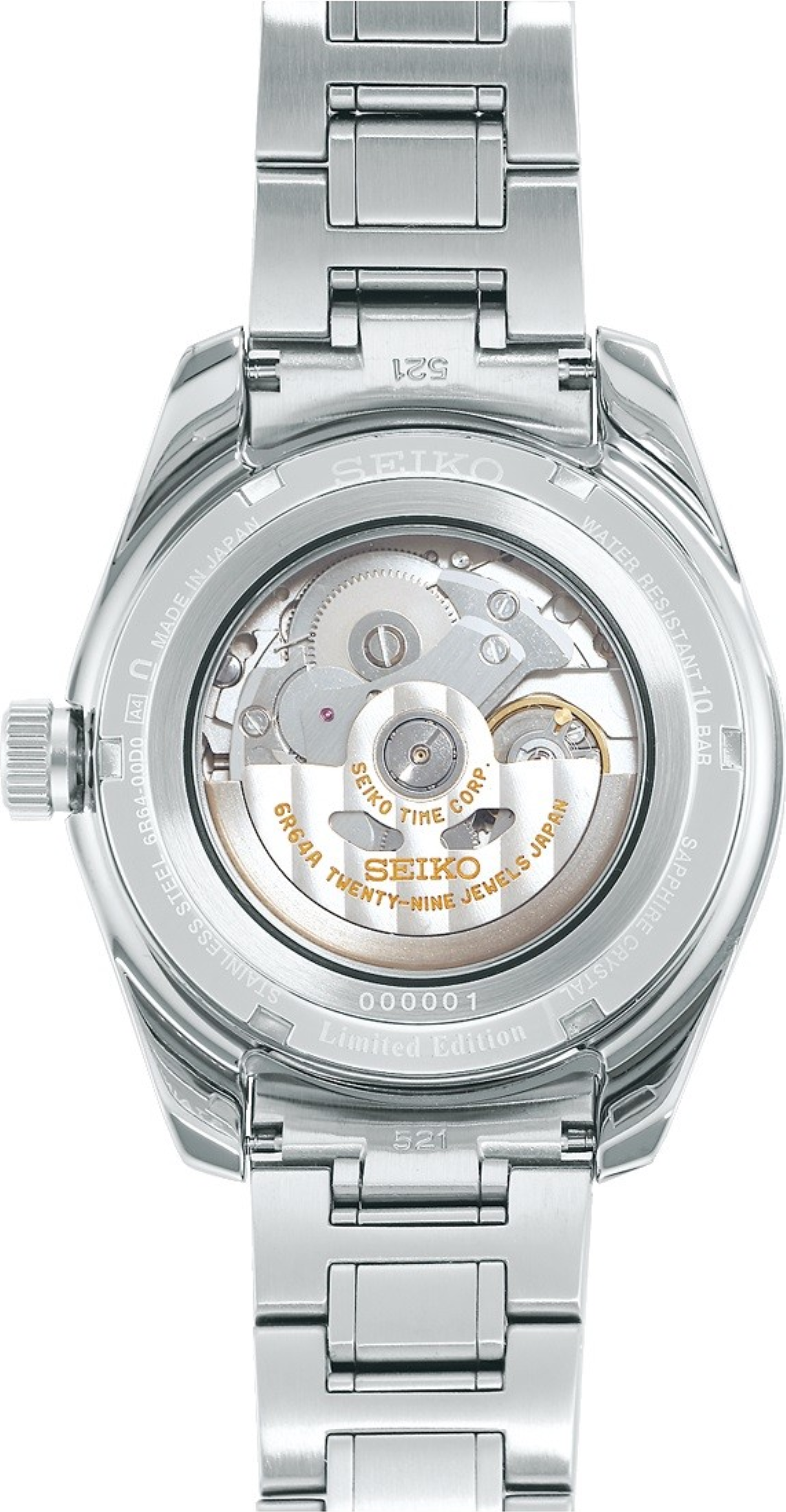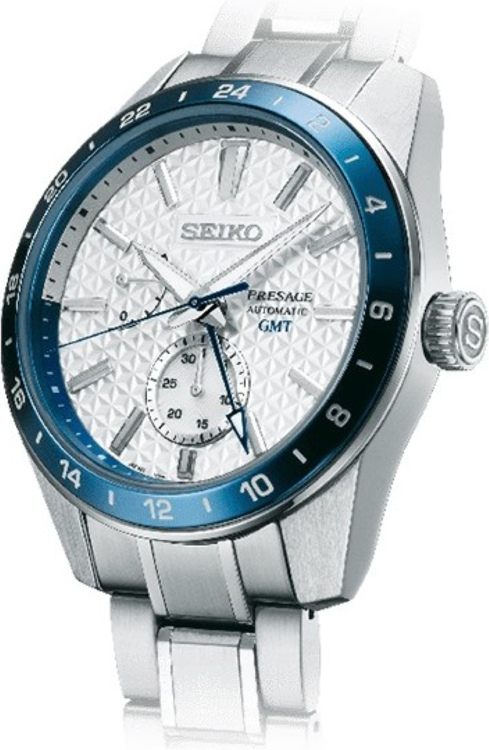 • Funkce a popis:Čas, ručičkový ukazatel datumu na subčíselníku nad číslicí 6, GMT, zobrazení rezervy chodu, 24hodinová ručička, strojek vlastní výroby (in-house) automatic Japan Seiko Caliber 4R64 (29 kamenových uložení), rezerva chodu 45 hodin, polokmity setrvačky 21.600/h = přesnost chodu 4 - 7 vteřin denně, vlásek setrvačky - Seiko Spron 510 (odolný vůči otřesům a běžnému magnetickému poli pro stabilní přesnost chodu), materiál hnací pružiny (pera) - Seiko Spron 510 (pero je antimagnetické a po celou dobu své životnosti zachovává stejnou tvrdost a pružnost, což je důležité pro trvalou a konstantní přesnost chodu strojku), hodinky jsou odolné magnetismu o síle 4.800 A/M (60 Gaussům = 5 cm, pro představu - mobilní telefon vzdálen od hodinek 5 cm zasahuje hodinky magnetickým polem o síle 400 A/M a přiblížíme-li hodinky na dotek k telefonu, hodinky zasáhne magnetické pole silou až 16.000 A/M), automatický nátah (hodinky se natahují pohybem ruky) + ruční nátah (hodinky lze natáhnout/dotáhnout i ručně korunkou, rotor samonátahu má oboustranný nátah, regulace přesnosti - ETACHRON (minimální vůle vlásku v zámečku regulační ručky zajišťuje vysokou přesnost hodinek), nárazuvzdor setrvačky Diashock (Seiko) = hodinky jsou již slušně odolné vůči nárazu (otřesu) či pádu, hodinky disponují funkcí strojku "Hacking" (při vytažení korunky do nejzažší polohy pro řízení ručiček se zastavuje vteřinová ručička), ručičky a indexy jsou opatřeny svítící vrstvou LumiBrite (nový druh luminiscenční barvy - od. r. 1995 - který svítí jasněji a déle než běžná luminiscenční vrstva a svítivost slábne v noci velmi pomalu), hodinky splňují normu antimagnetičnosti ISO 764
