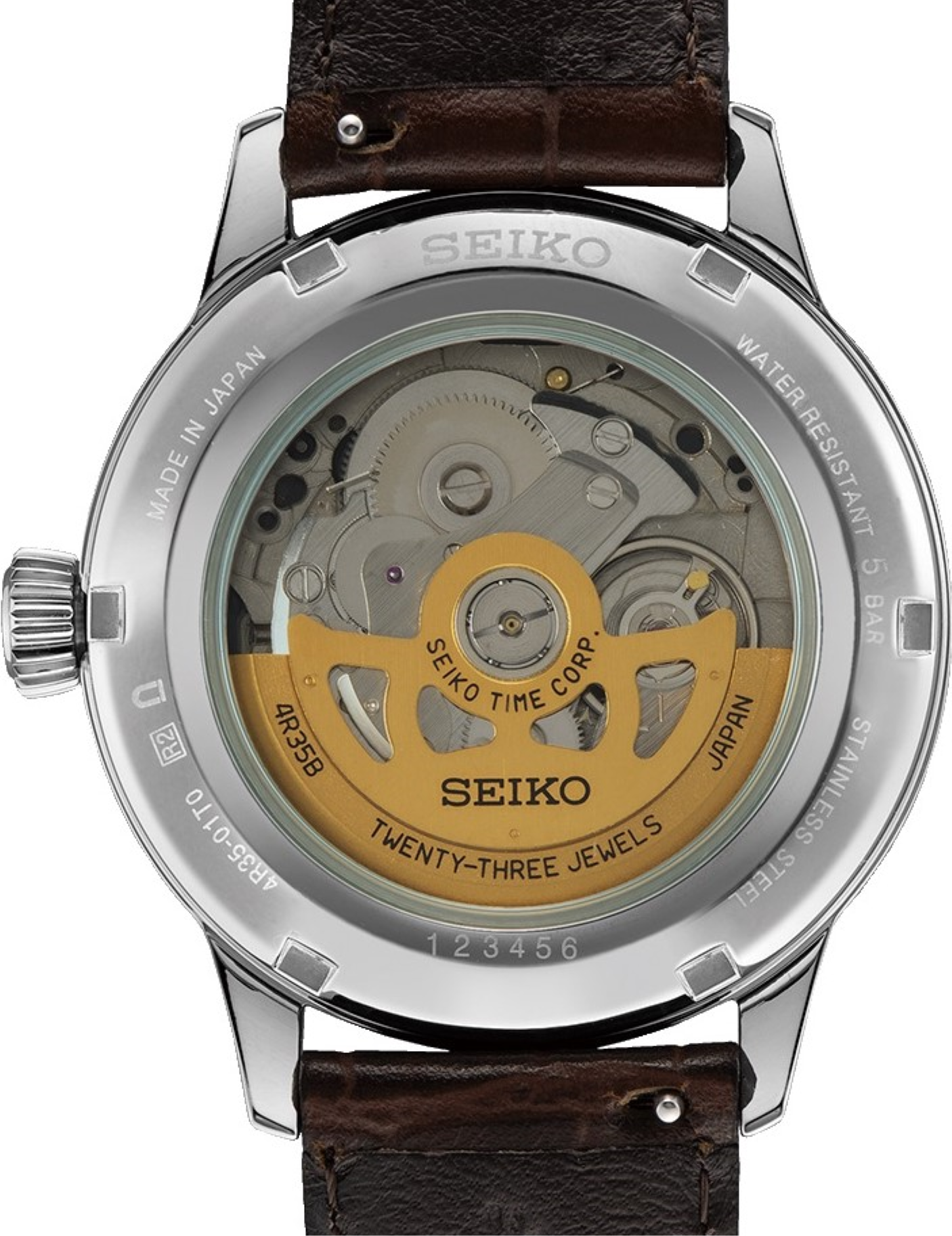• Funkce a popis:Čas, datum, ukazatel rezervy chodu, strojek vlastní výroby (in-house) automatic Japan Seiko Caliber 4R35 (23 kamenových uložení), rezerva chodu 41 hodin, polokmity setrvačky 21.600/h = přesnost chodu 4 - 7 vteřin denně, vlásek setrvačky - Seiko Spron 510 (odolný vůči otřesům a běžnému magnetickému poli pro stabilní přesnost chodu), materiál hnací pružiny (pera) - Seiko Spron 510 (pero je antimagnetické a po celou dobu své životnosti zachovává stejnou tvrdost a pružnost, což je důležité pro trvalou a konstantní přesnost chodu strojku), hodinky jsou odolné magnetismu o síle 4.800 A/M (60 Gaussům = 5 cm, pro představu - mobilní telefon vzdálen od hodinek 5 cm zasahuje hodinky magnetickým polem o síle 400 A/M a přiblížíme-li hodinky na dotek k telefonu, hodinky zasáhne magnetické pole silou až 16.000 A/M), automatický nátah (hodinky se natahují pohybem ruky) + ruční nátah (hodinky lze natáhnout/dotáhnout i ručně korunkou, rotor samonátahu má oboustranný nátah, regulace přesnosti - ETACHRON (minimální vůle vlásku v zámečku regulační ručky zajišťuje vysokou přesnost hodinek), nárazuvzdor setrvačky Diashock (Seiko) = hodinky jsou již slušně odolné vůči nárazu (otřesu) či pádu, hodinky disponují funkcí strojku "Hacking" (při vytažení korunky do nejzažší polohy pro řízení ručiček se zastavuje vteřinová ručička), hodinky splňují normu antimagnetičnosti ISO 764